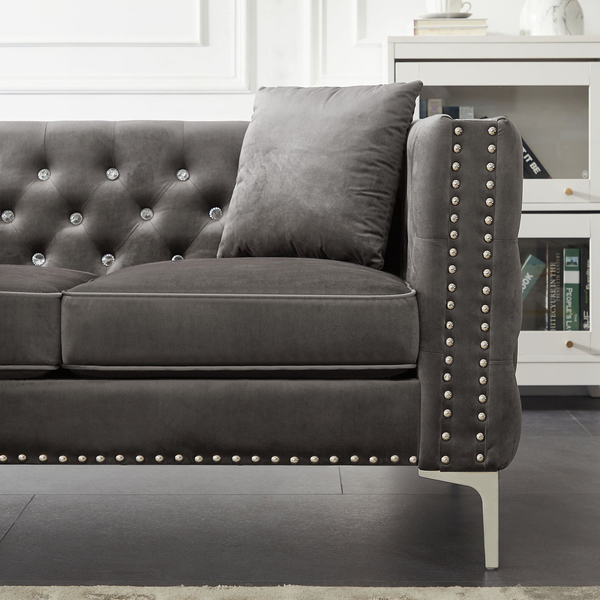 Modern Sofa Jeweled Buttons Tufted Square Arm Couch, 2 Pillows Included - Gray