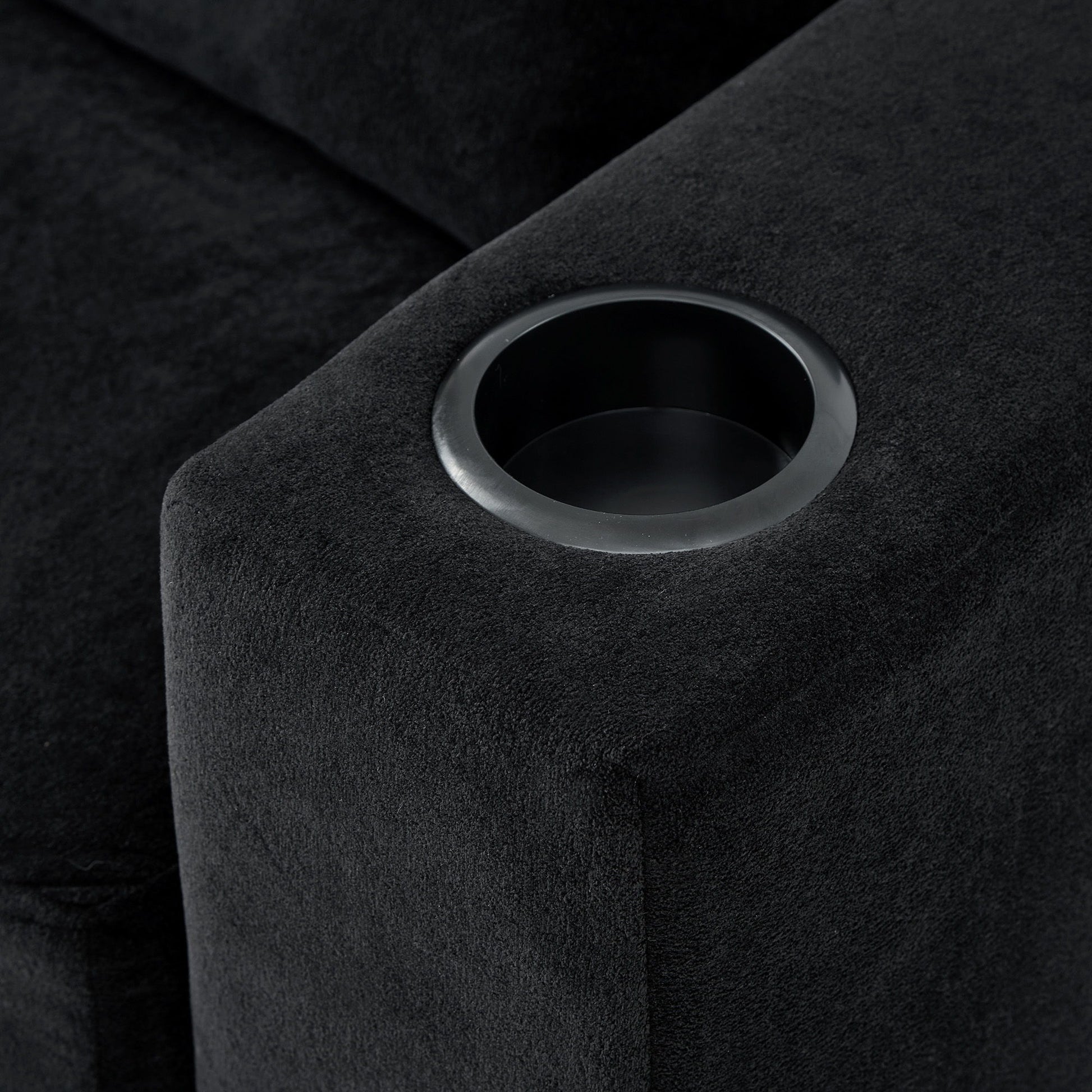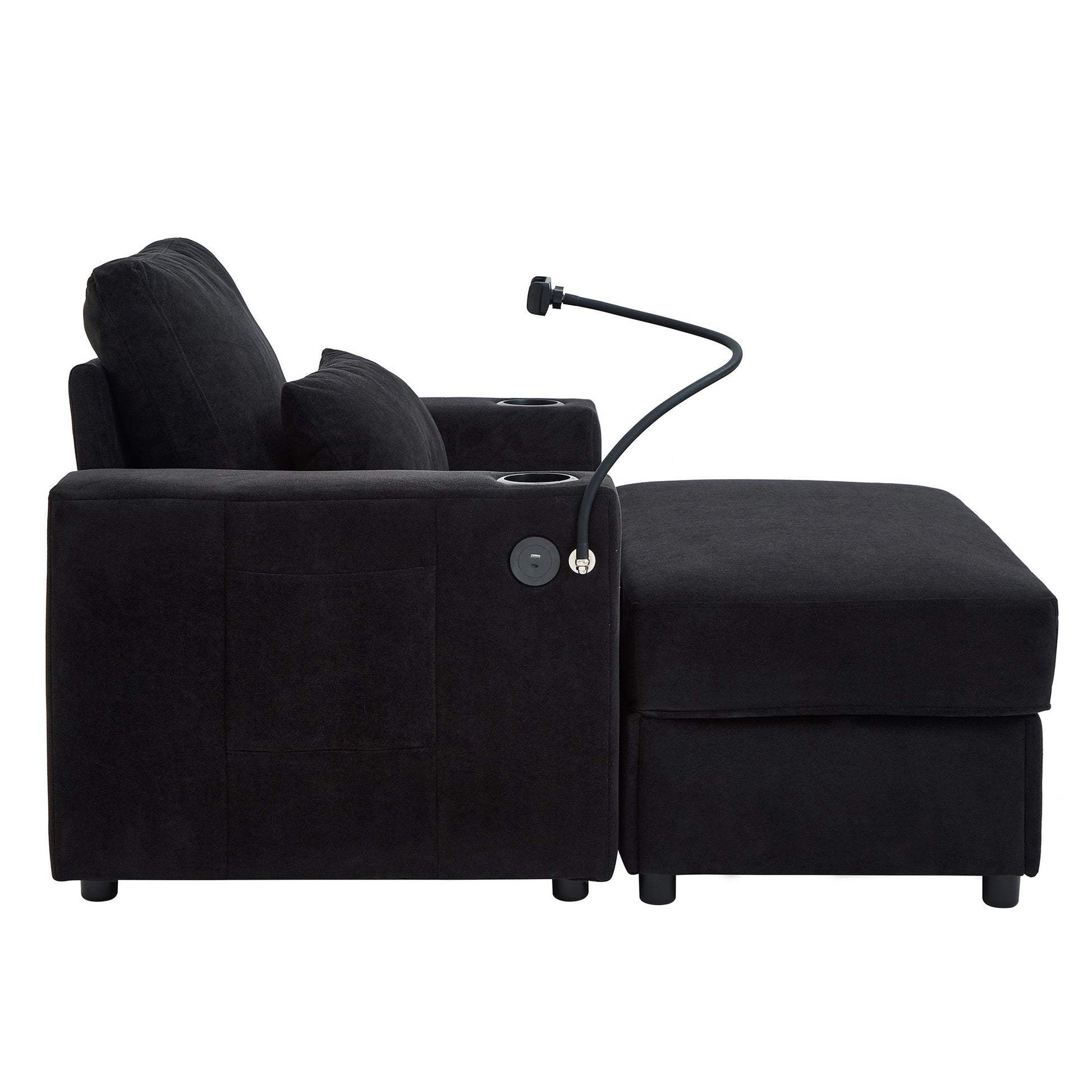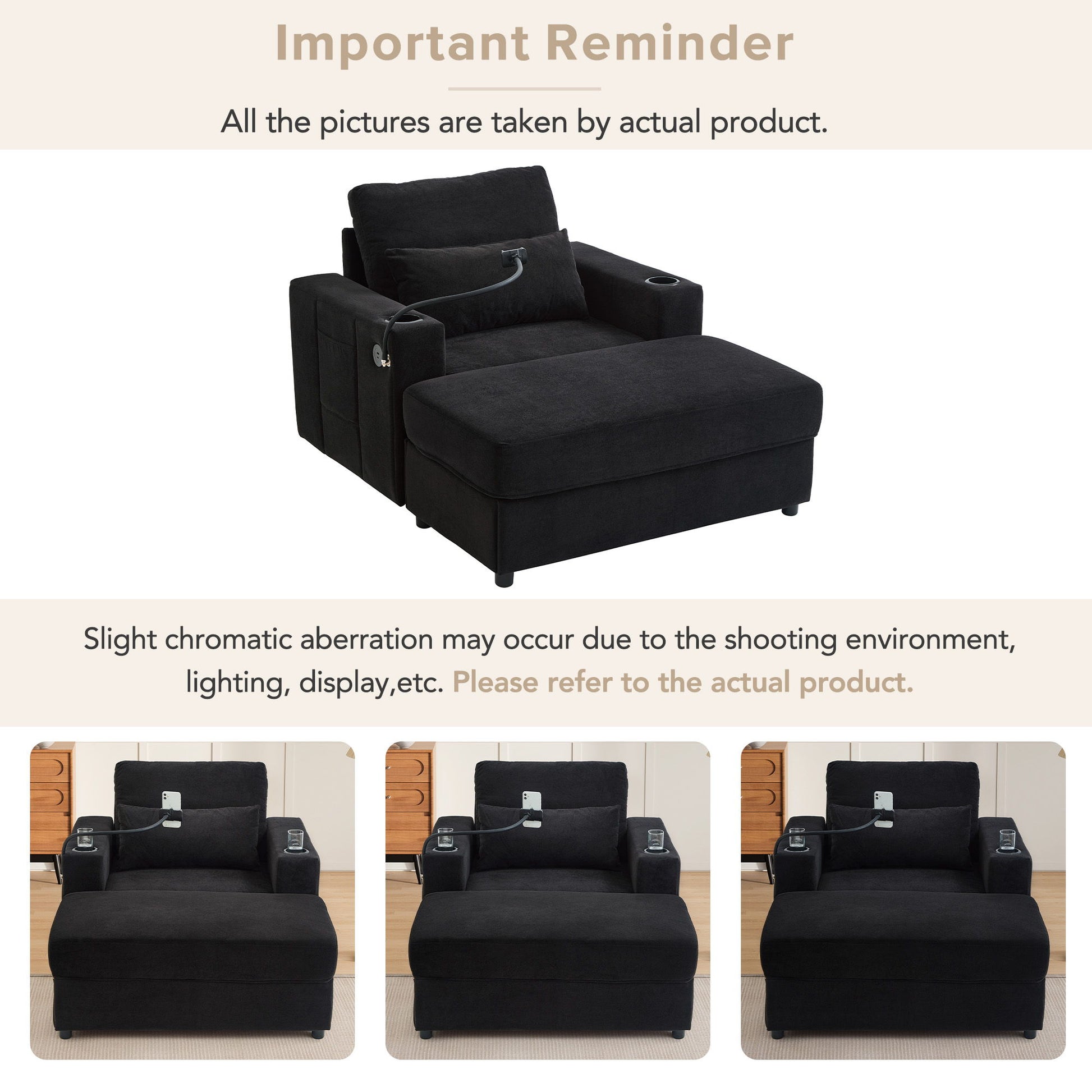 Modern Style Armchair Chaise Lounge Sofa Couch With Movable Storage Ottoman, USB Ports, Cup Holders & Side Pockets Chenille - Black