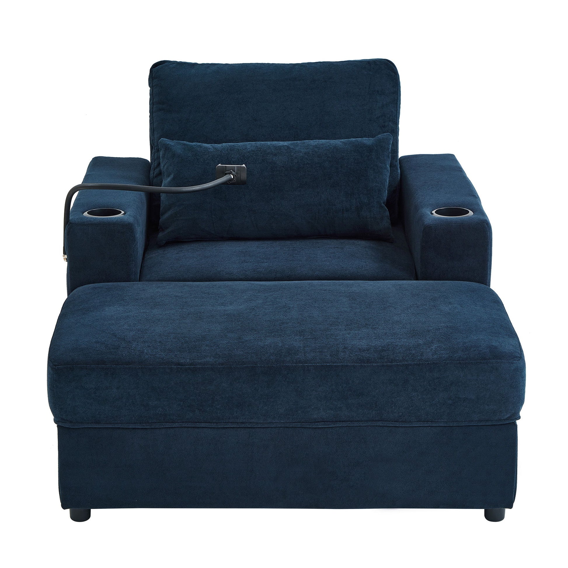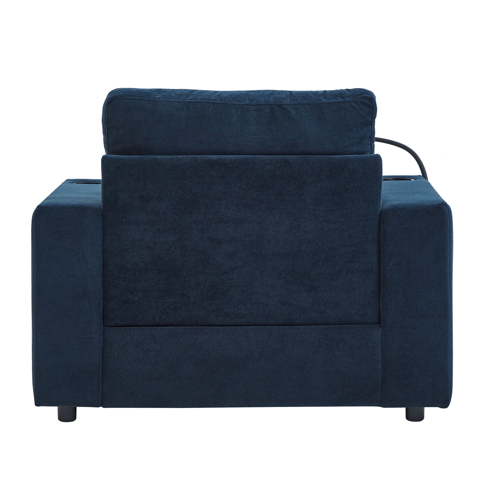 Modern Style Armchair Chaise Lounge Sofa Couch With Movable Storage Ottoman, USB Ports, Cup Holders, Phone Holder, Side Pockets - Blue