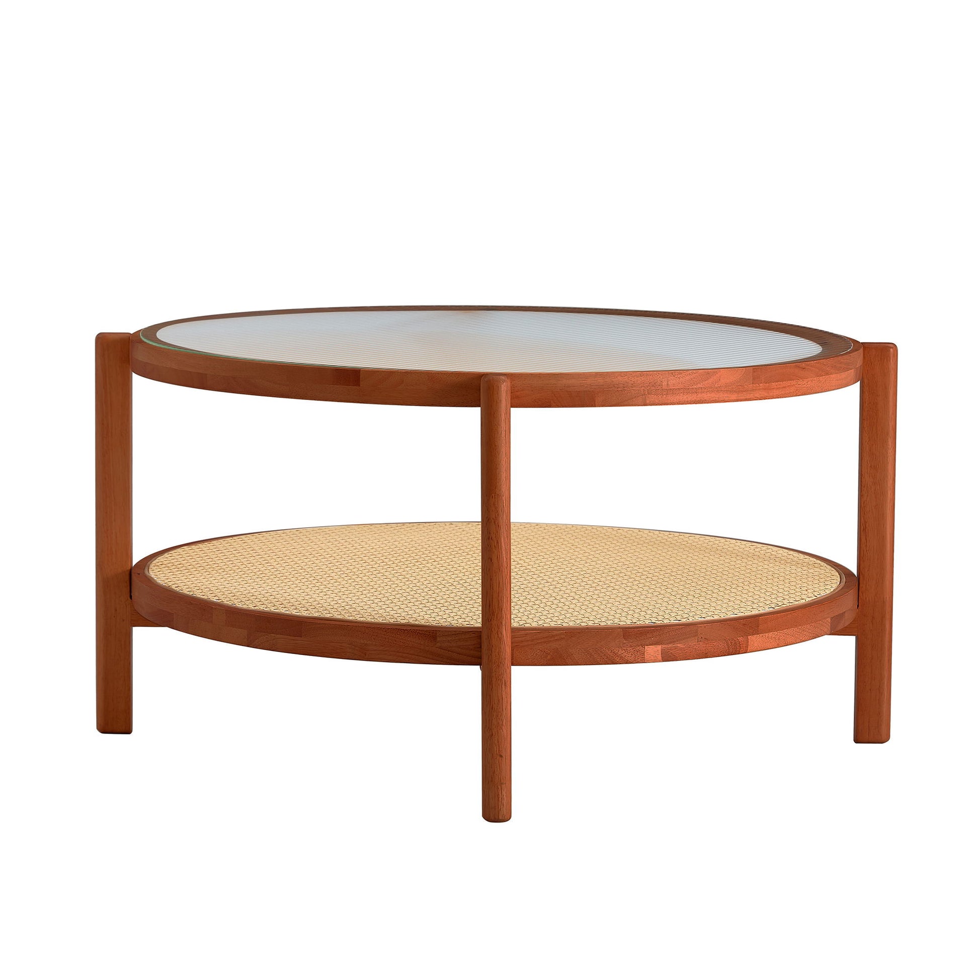 Modern Minimalist Circular Double Layer Solid Wood Coffee Table With Glass Top, Rattan Layer - Walnut