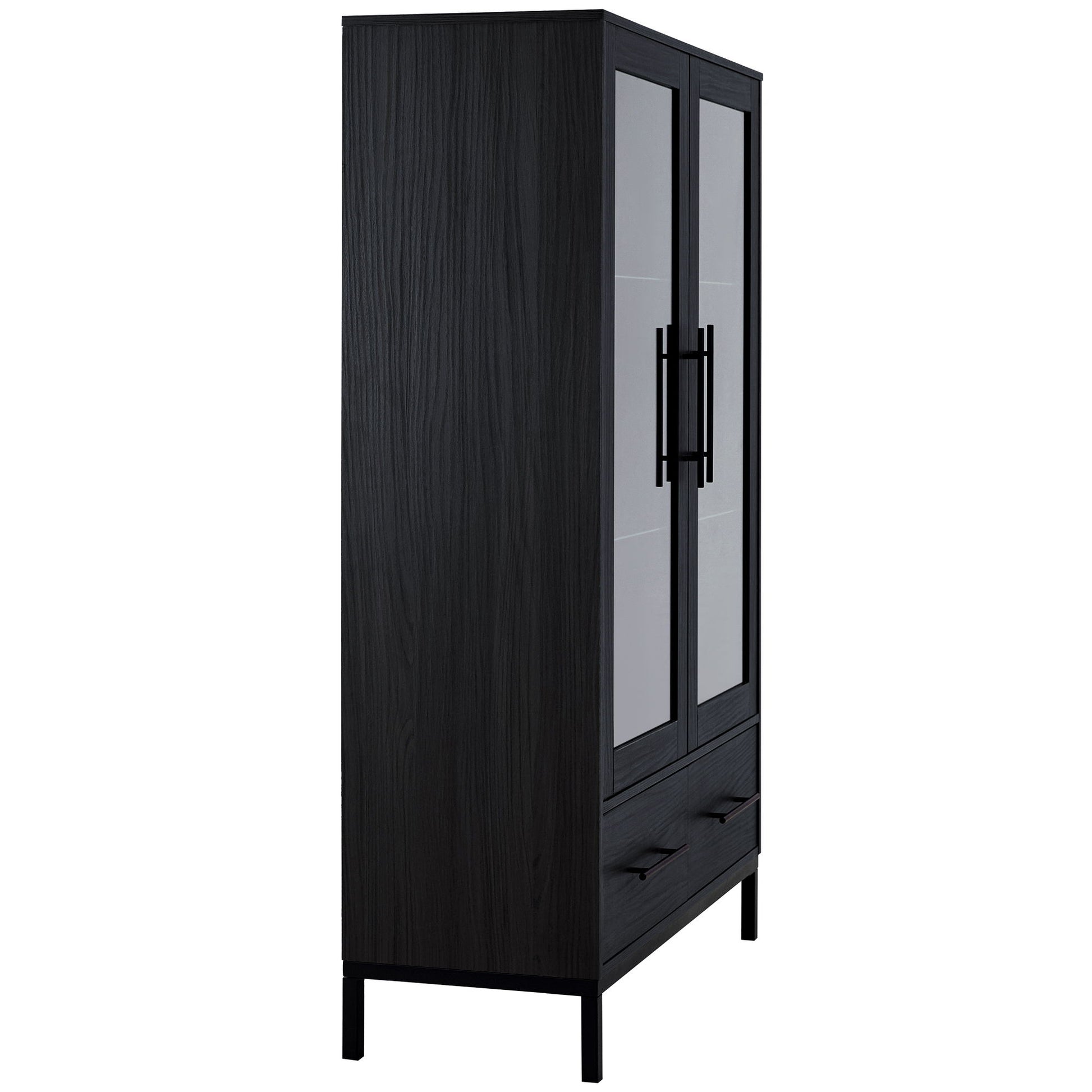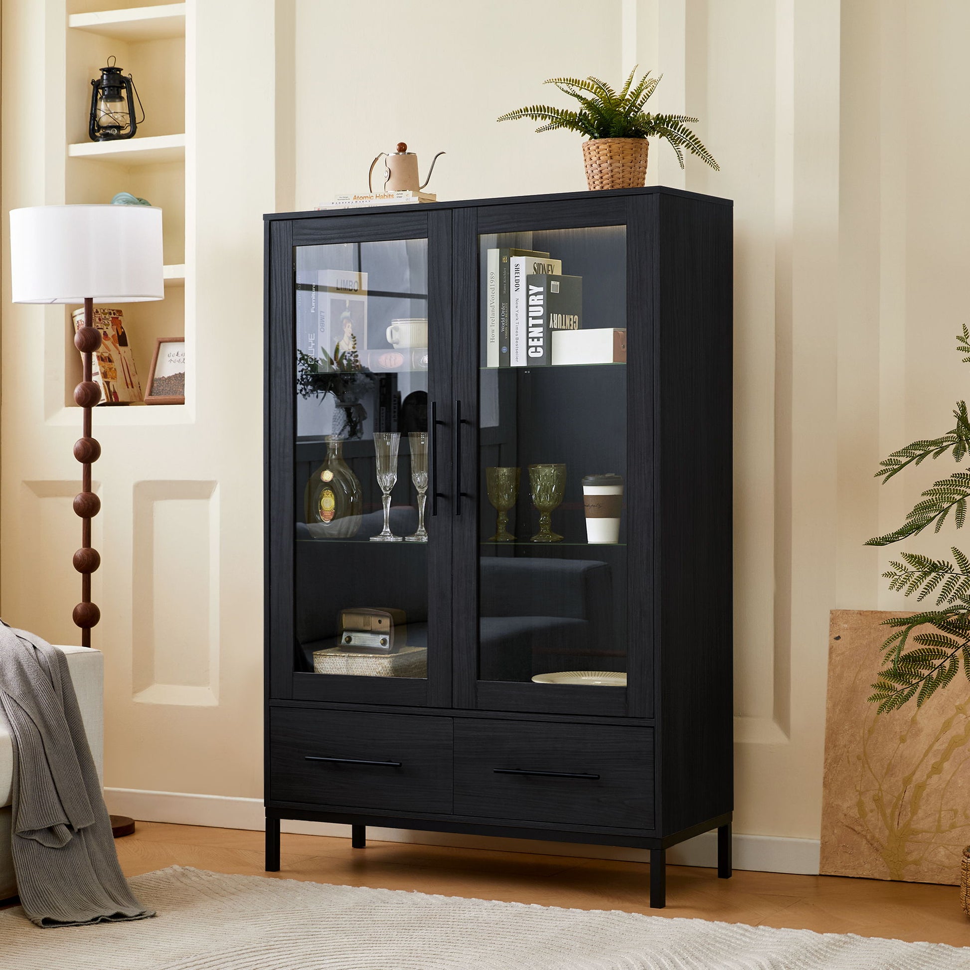 Modern Style Tall Display Cabinet With LED Lighting, Tempered Glass Door, 2 Drawers - Black