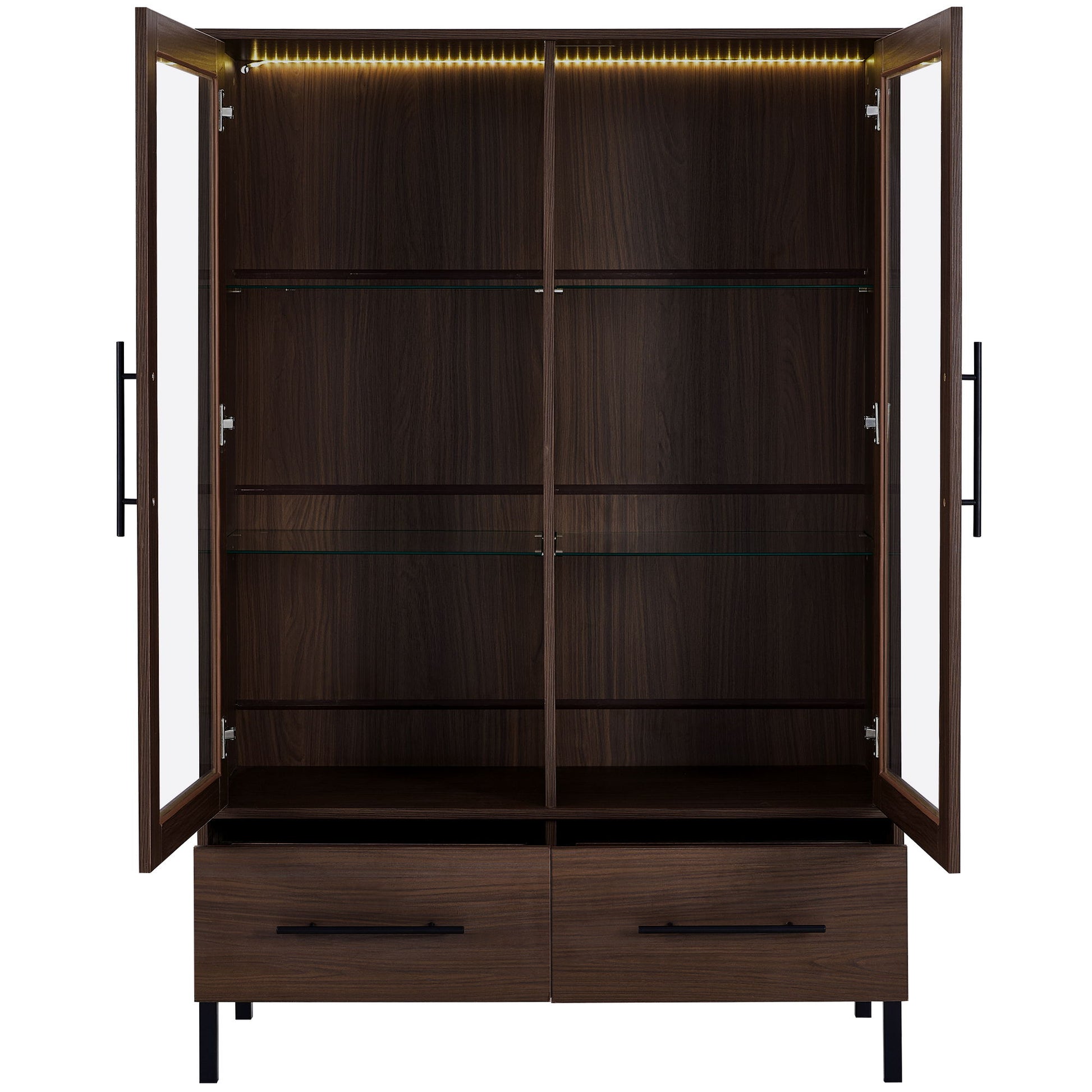 Modern Style Tall Display Cabinet With LED Lighting, Tempered Glass Door, 2 Drawers - Black / Dark Walnut