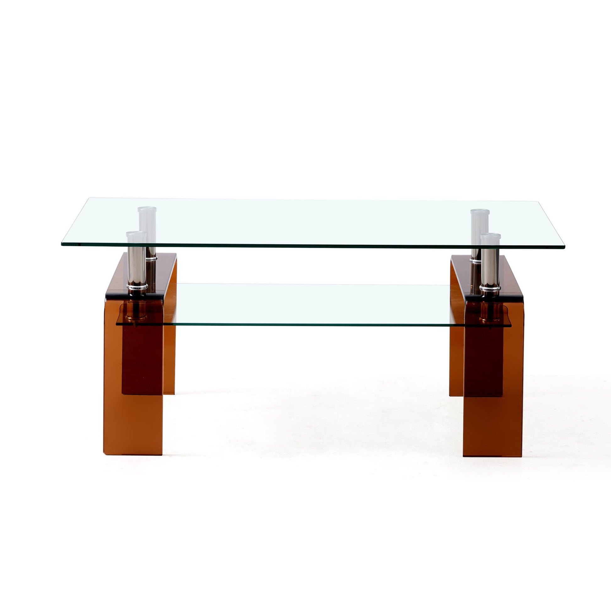 Modern Tempered Glass Coffee Table With 2 Tier Storage And Brown Legs For Living Room - Transparent