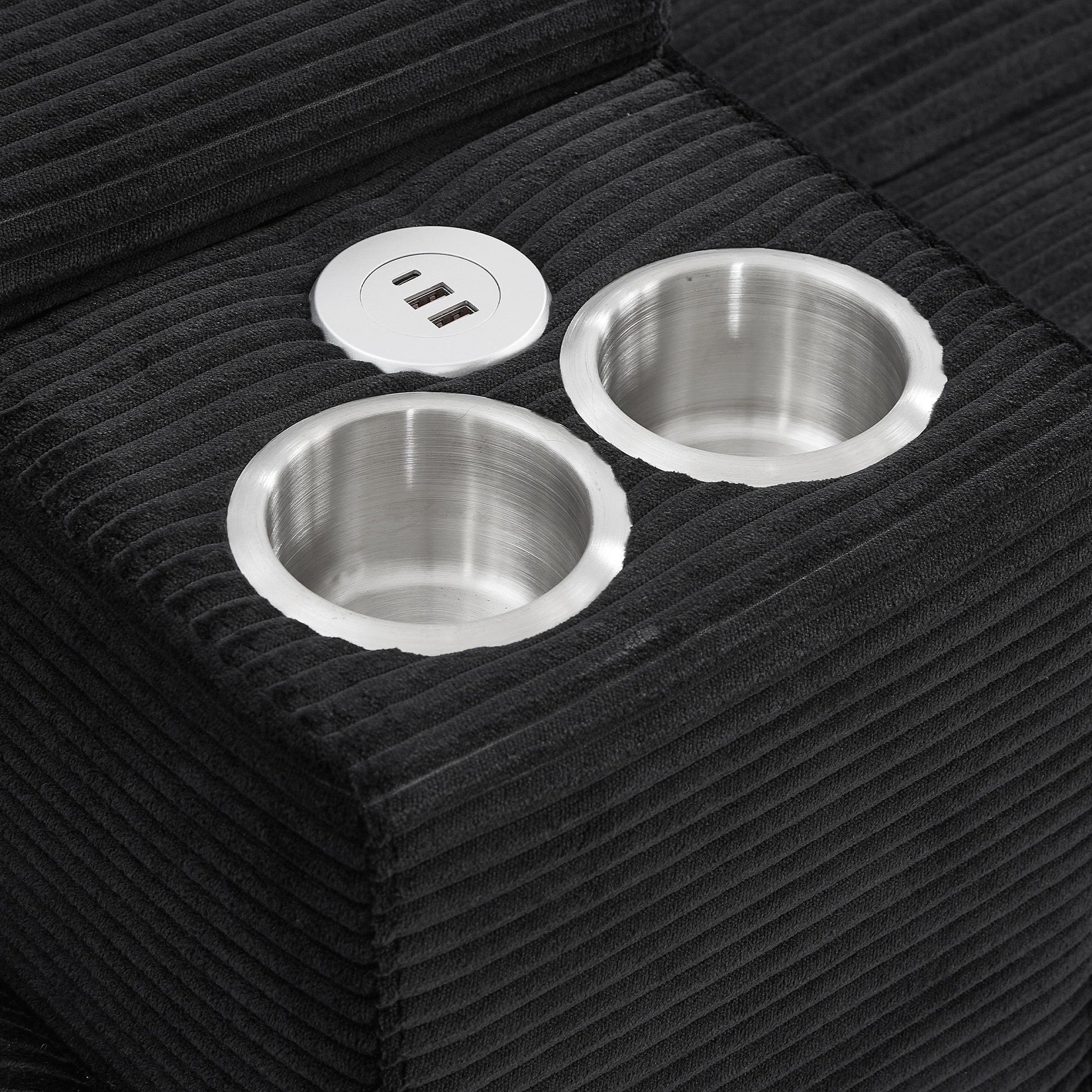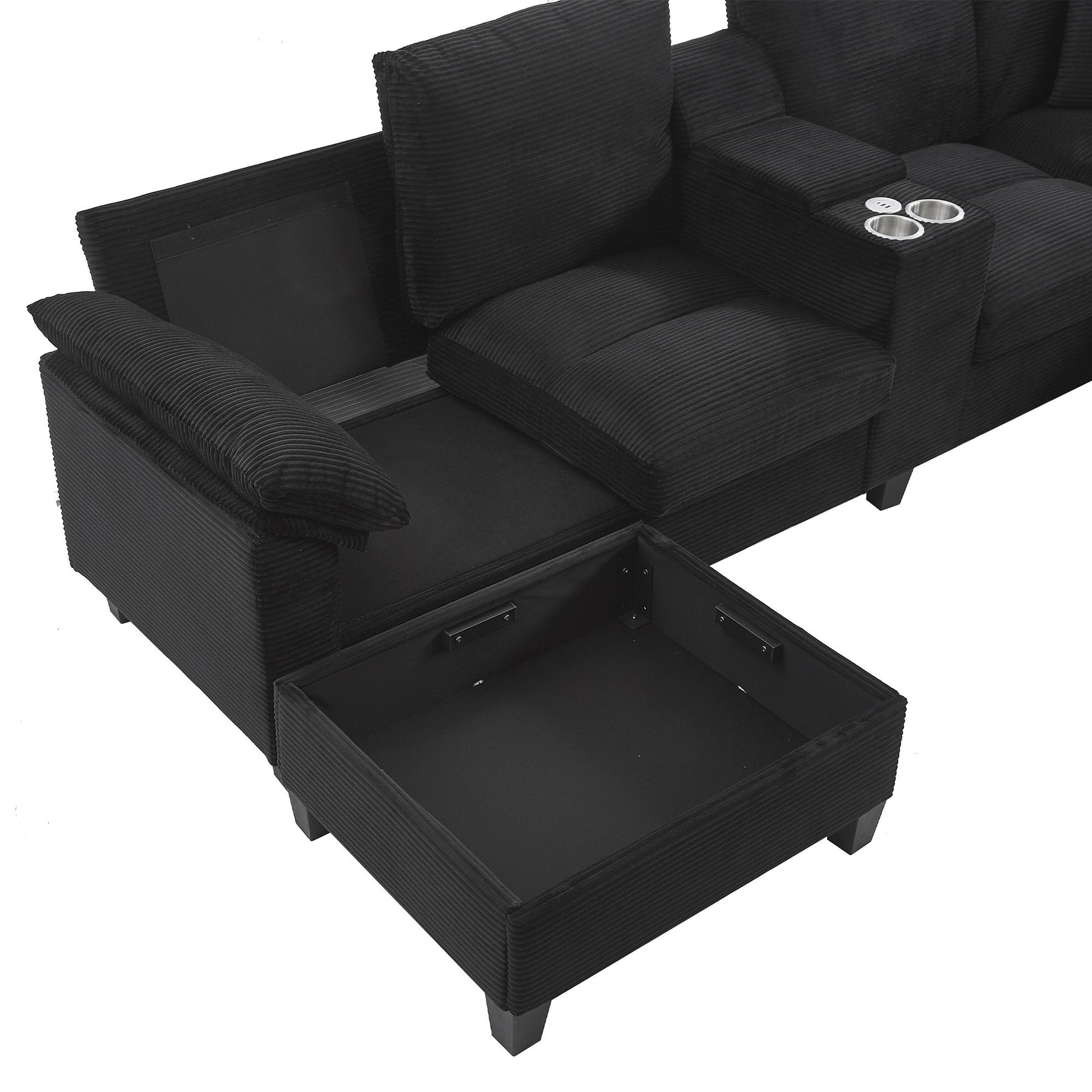 U-Shaped Sectional Sofa, Hidden Storage Ottomans, USB Ports, And Cup Holders - Black