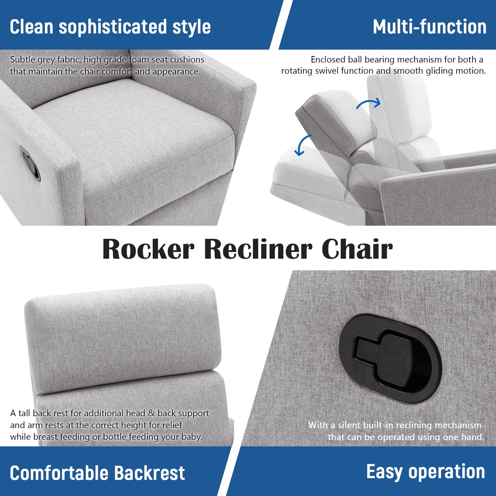 - Modern Design: The Modern Upholstered Rocker Nursery Chair combines clean lines with square arms and a tall back, offering a stylish look that serves as both a recliner and a relaxing rocker with smooth motion.