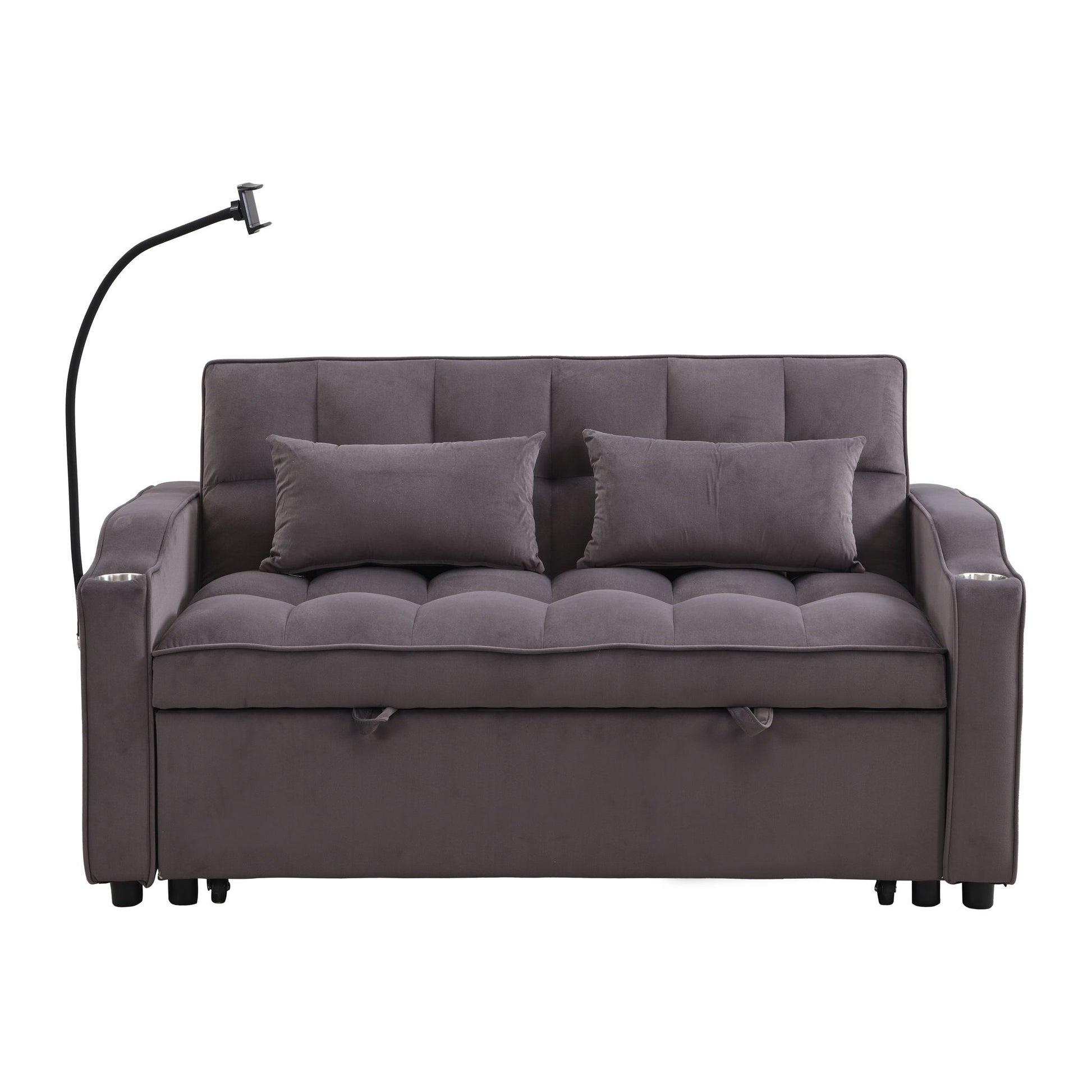 Modern Velvet Loveseat Futon Sofa W / Pullout Bed, Adjustable Reclining Backrest, Toss Pillows - Dark Gray