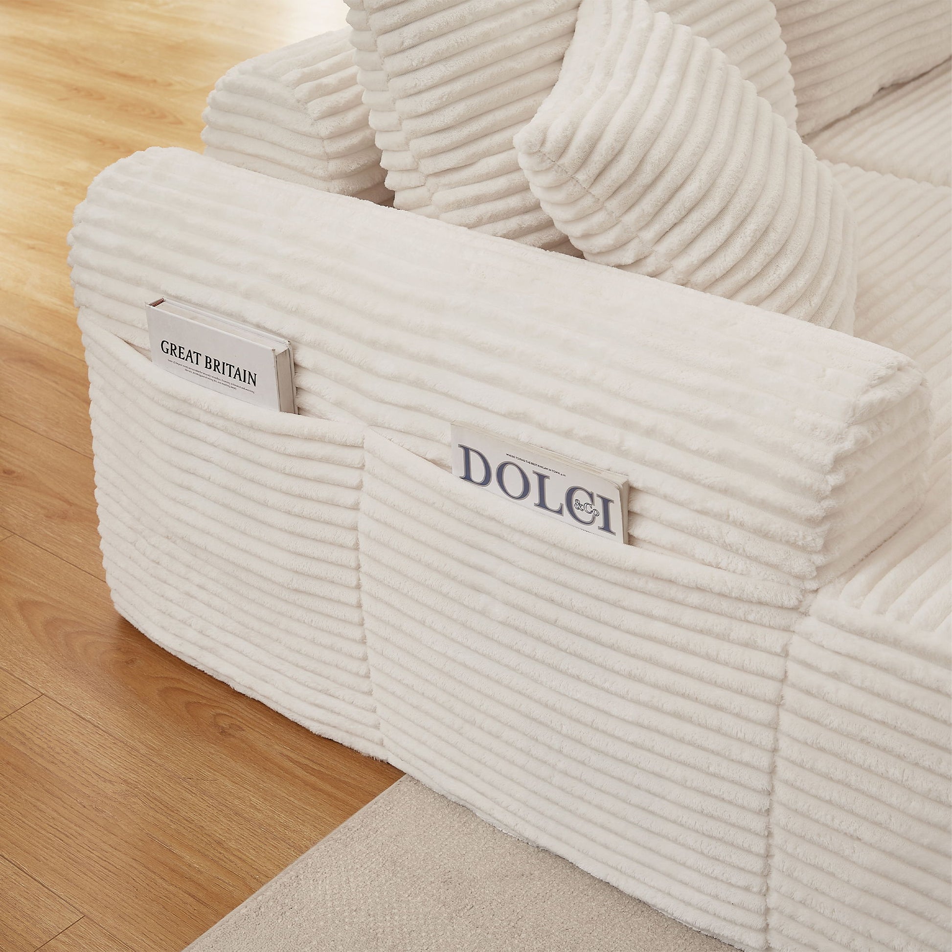 Full Compression Chaise Lounge Set Modular Corduroy Sectional With Arched Armrests Non Slip Base Includes 3 Back Cushions & 2 Throw Pillows - White