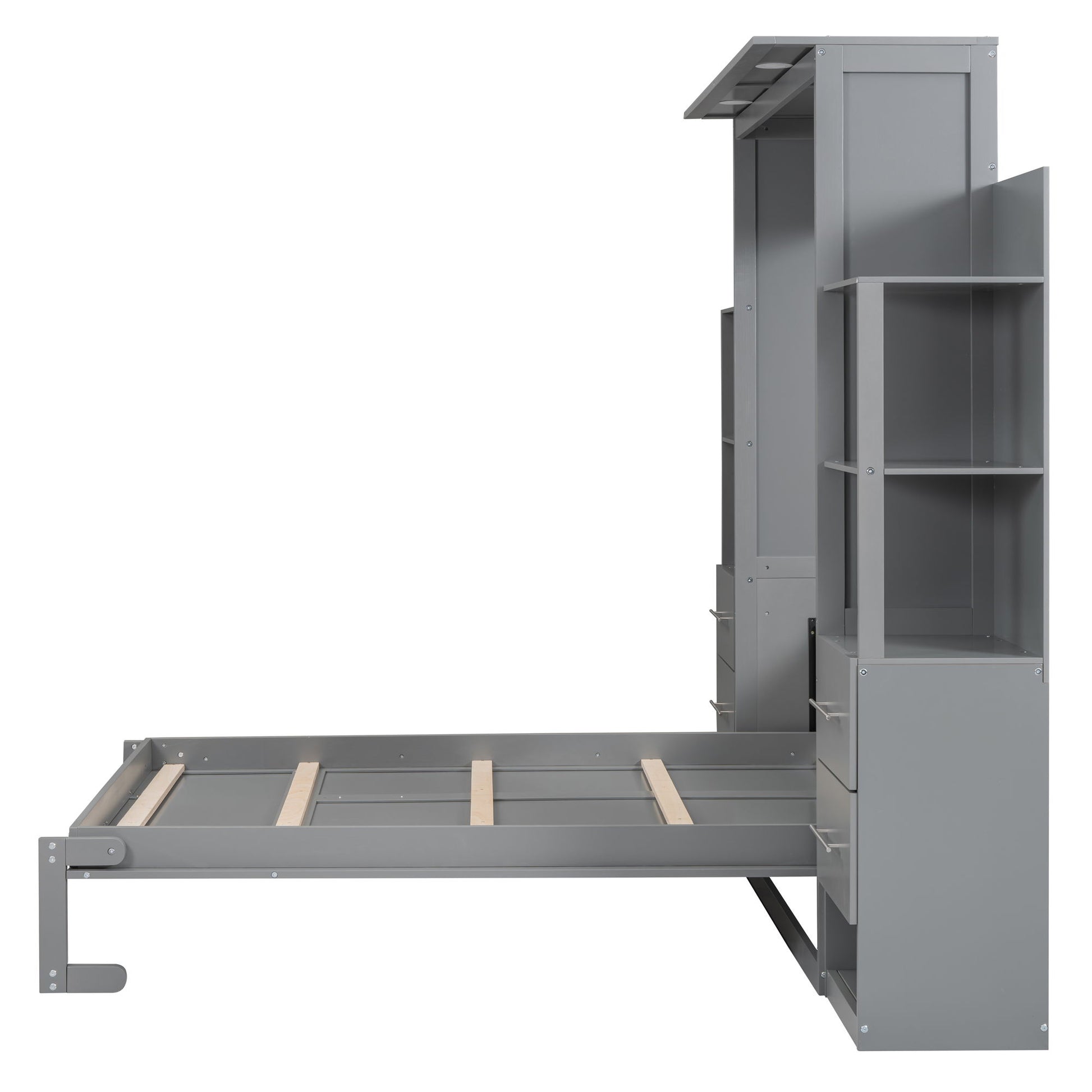 Full Size Murphy Wall Bed With Shelves, Drawers And LED Lights - Gray