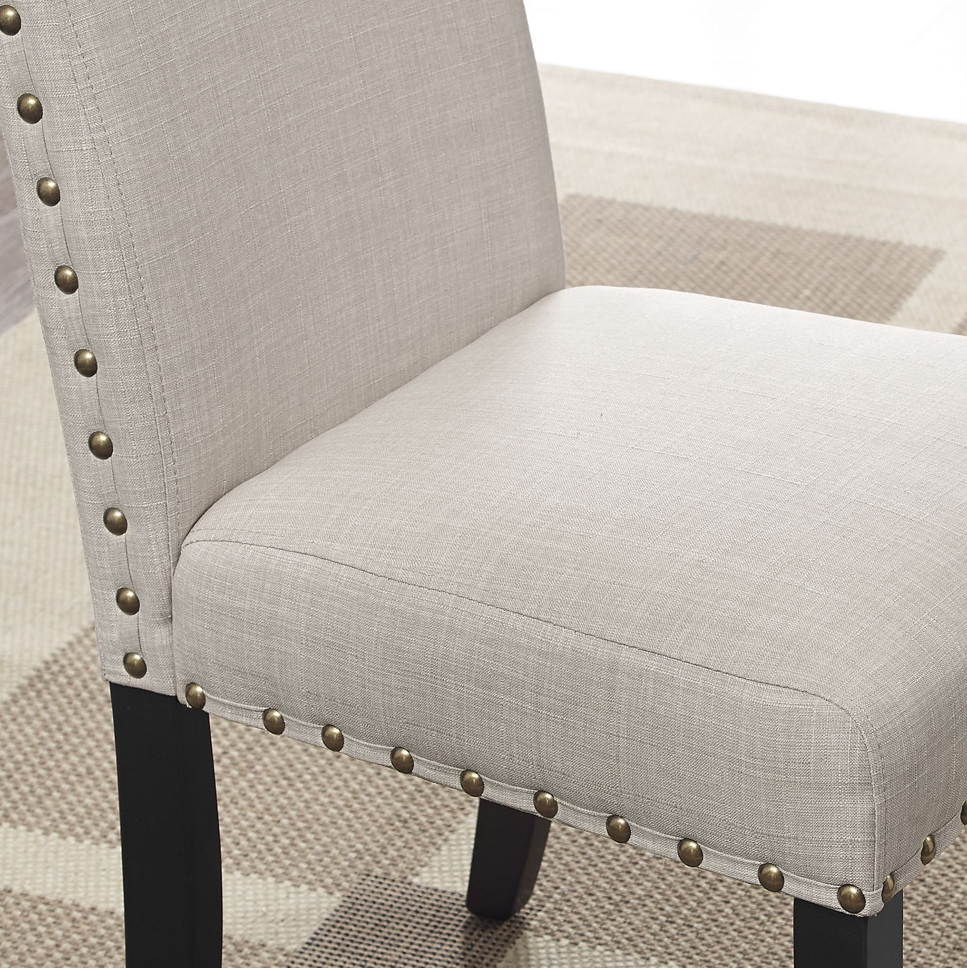 - Elegant and Cozy Atmosphere: Round table with stable cross-buck pedestal base in black finish. Chairs feature fabric upholstery with brass nailheads for a timeless look.