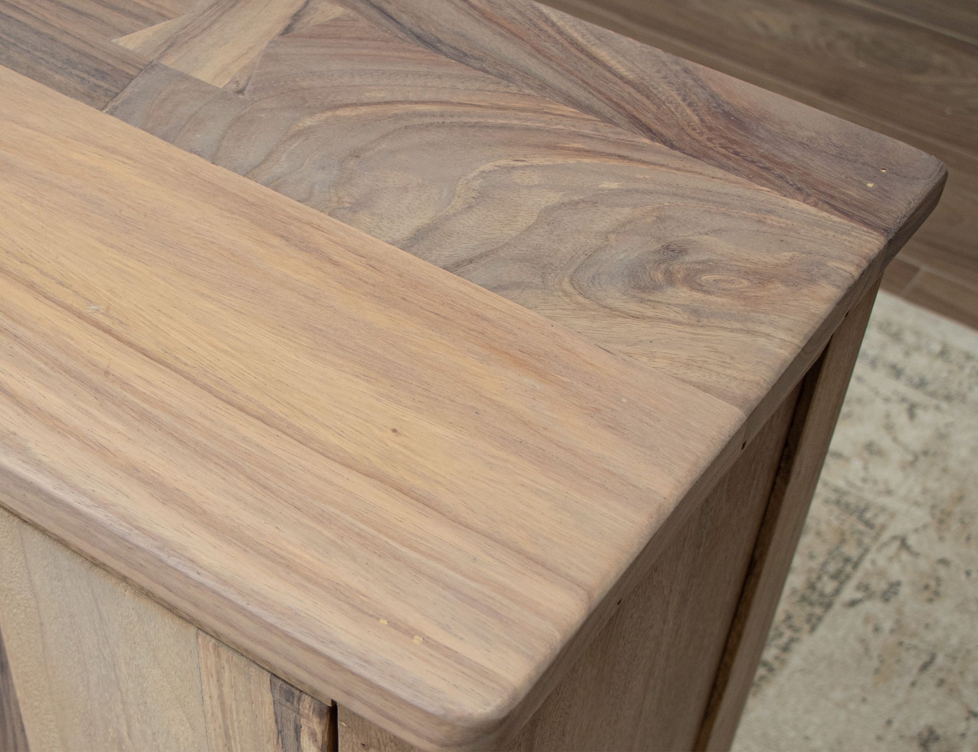 - Tops are crafted from parota wood, while sustainable mango wood is used for the rest of the case piece.