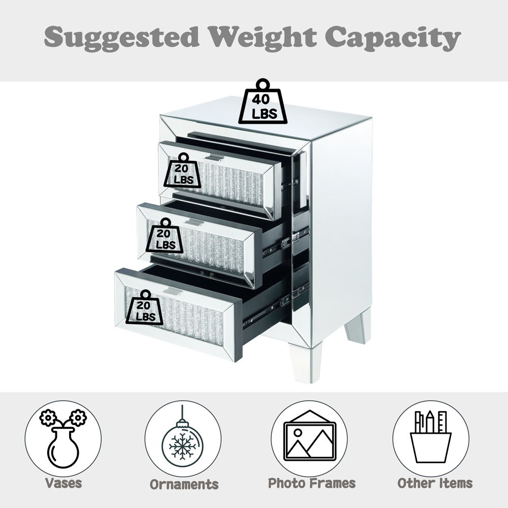 - Features: Mirrored Finish, Front Drawer w/Faux Diamonds & Clear Glass, Mirrored Tapered Leg