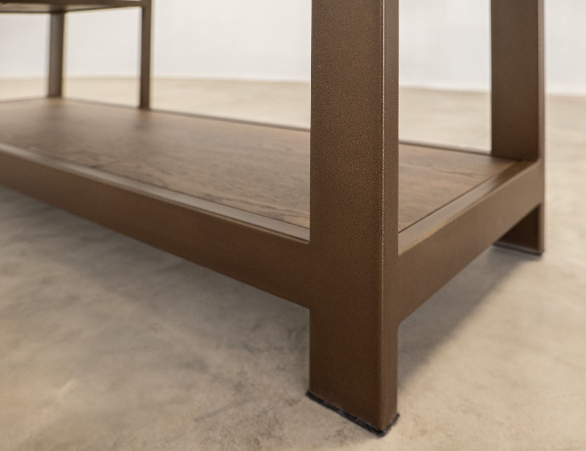- Finish is achieved through a multi-step lacquer in brown tones.
