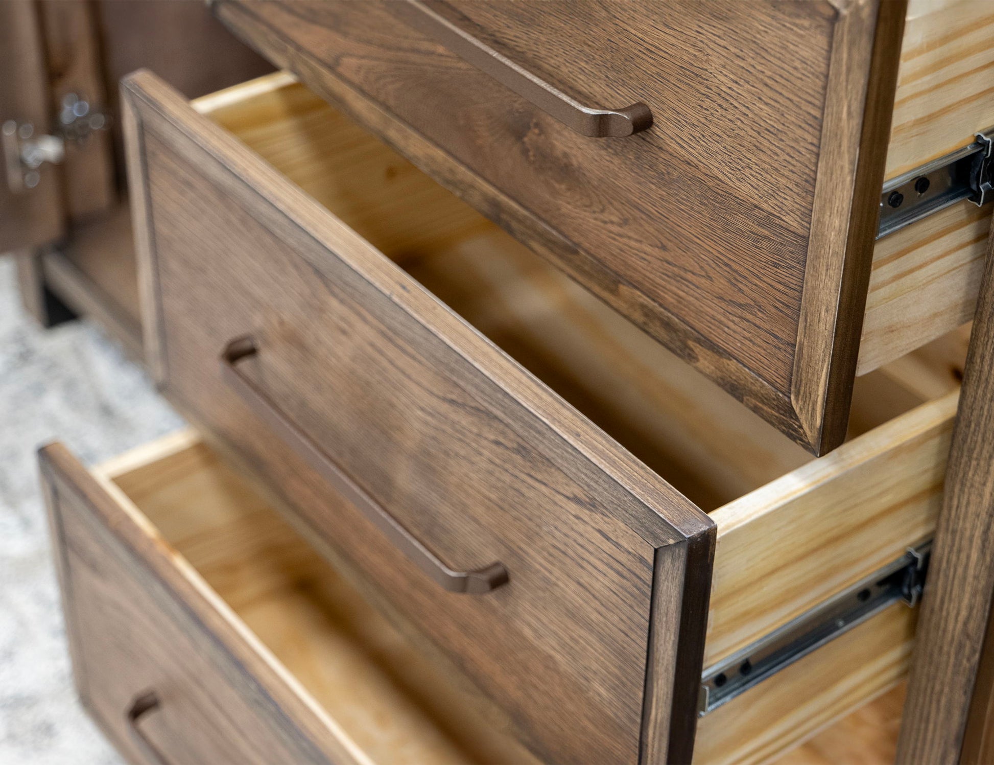 - English dovetail on 100% solid wood drawer fronts. Hafele steel slides.
