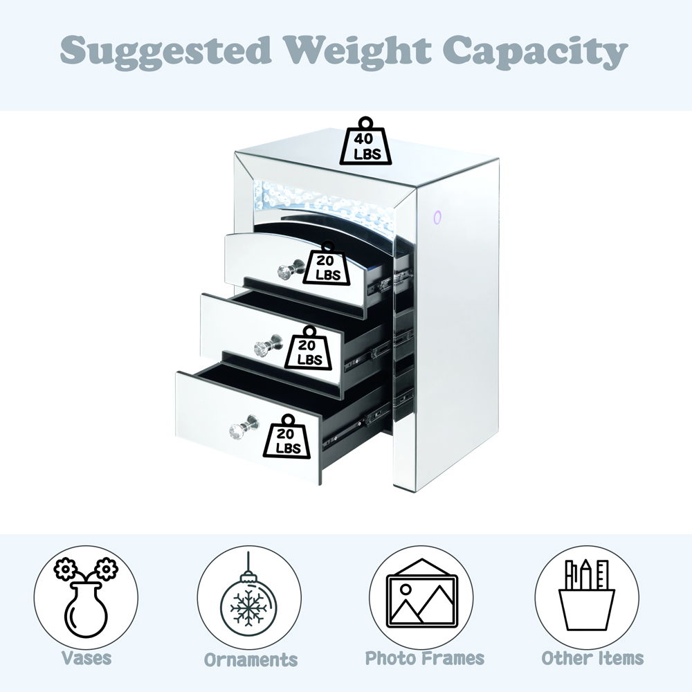 - Features: Mirrored Finish, LED w/Faux Diamonds & Clear Glass, Mirrored Sled Base