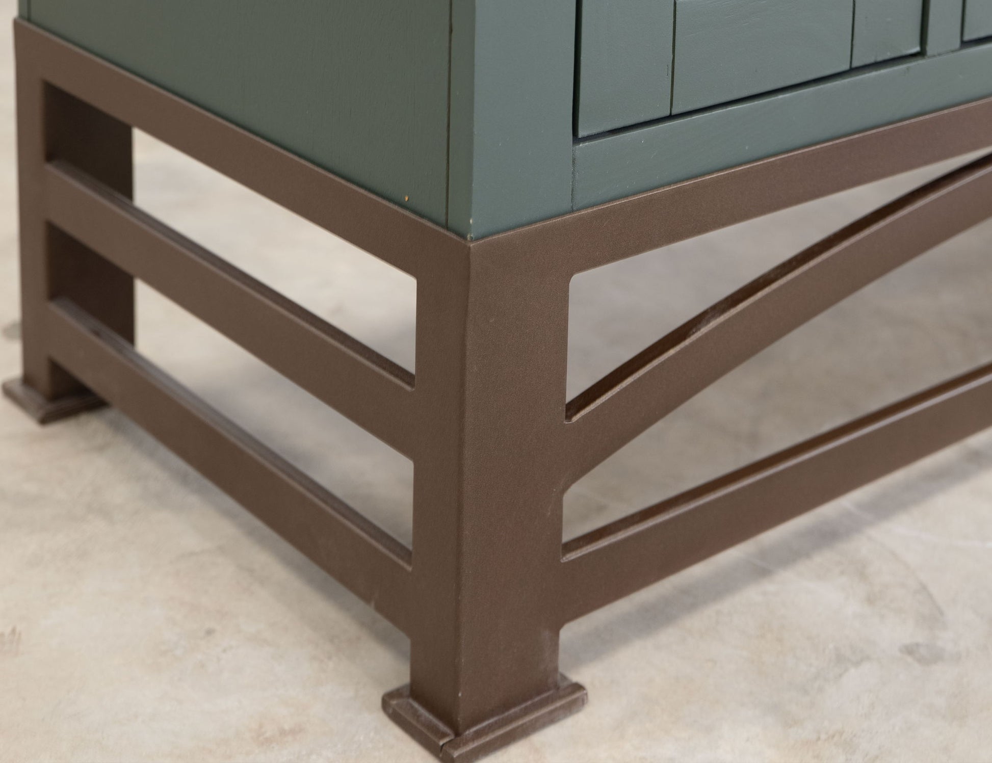 - The metal base undergoes meticulous hand-cutting and welding and is then coated with a unique electrostatic paint to enhance its durability and resistance to corrosion.