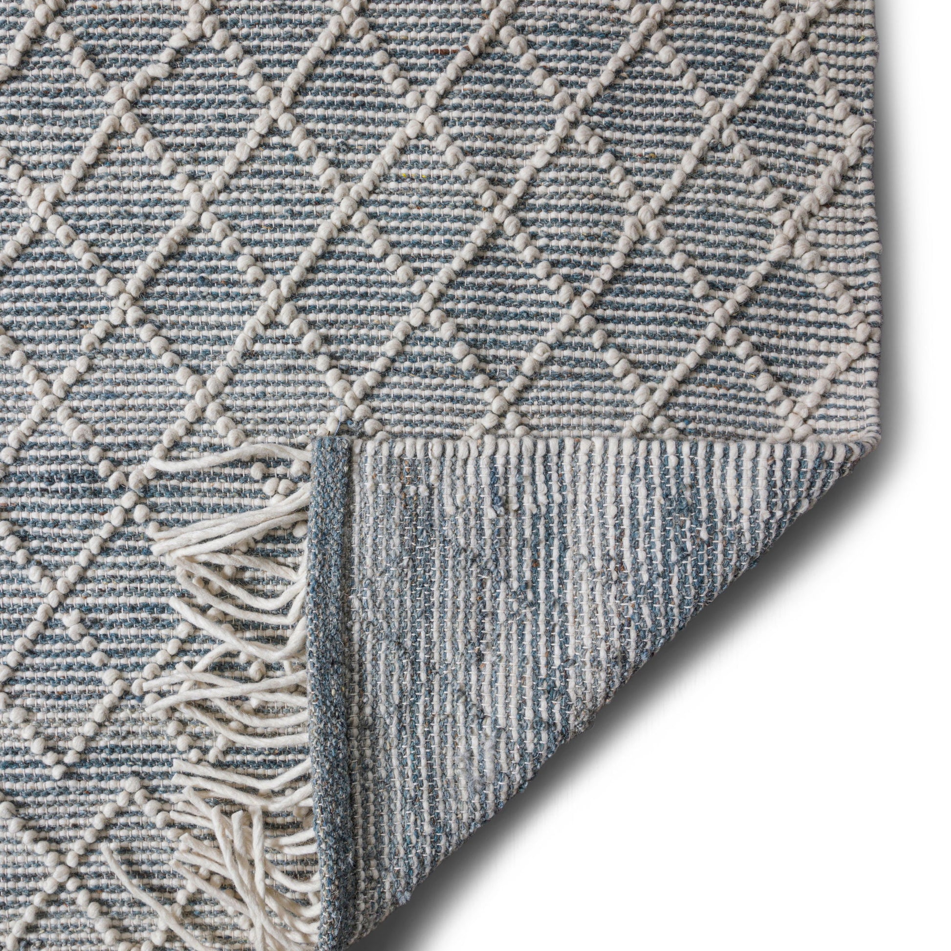 - Detailed with a diamond pattern invory and teal featuring a hand-knotted fringe