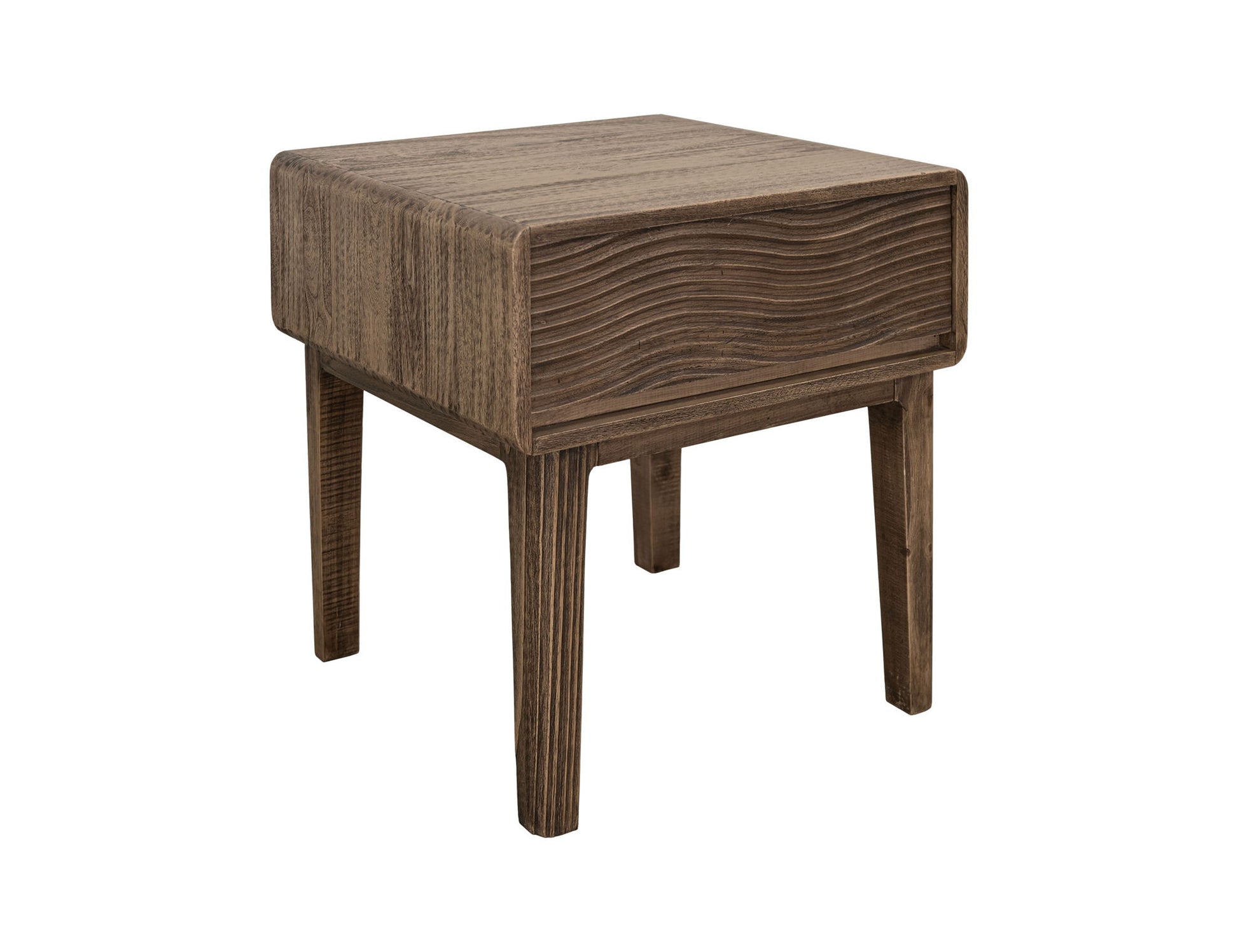 - Lightly distressed wood with a brown multi-step lacquer finish.