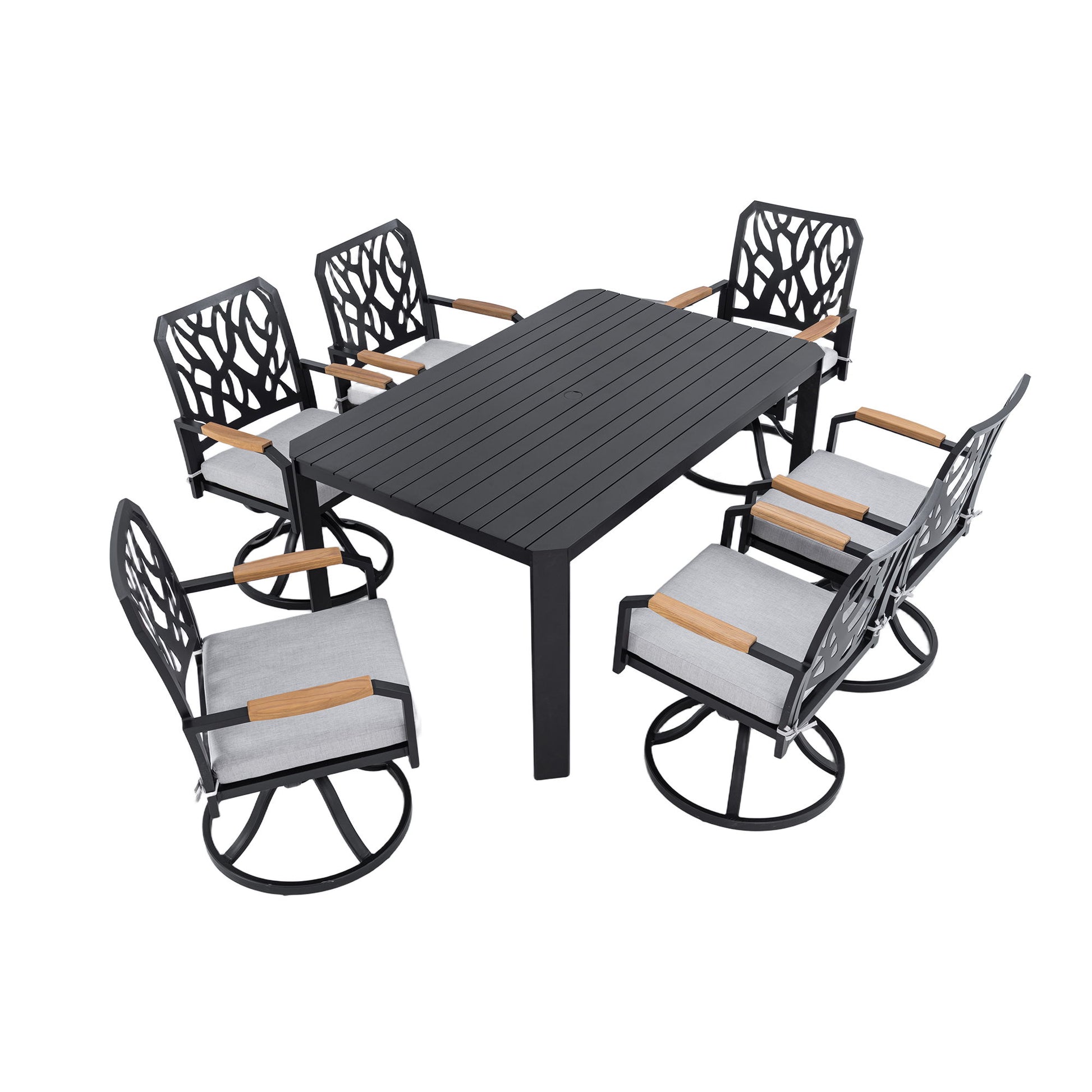 7 Pieces Outdoor Patio Furniture Set, Modern Dining Set With 6 Swivel Rockers Sunbrella Fabric, Rectangular Table With Umbrella Hole - Bourbon Brown