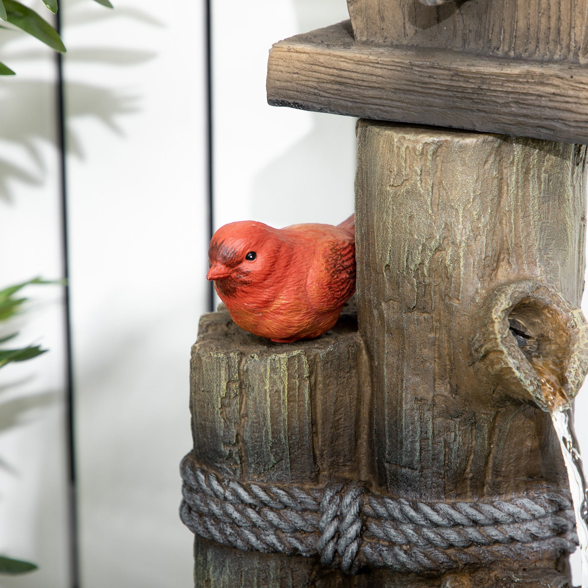 Outsunny - Outdoor Fountain With Birdhouse, Cascading Garden Waterfall Bird Bath With 3 Tier Rustic Tree Trunk / Log Design, LED Lights For Porch, Deck, Yard Decor - Brown