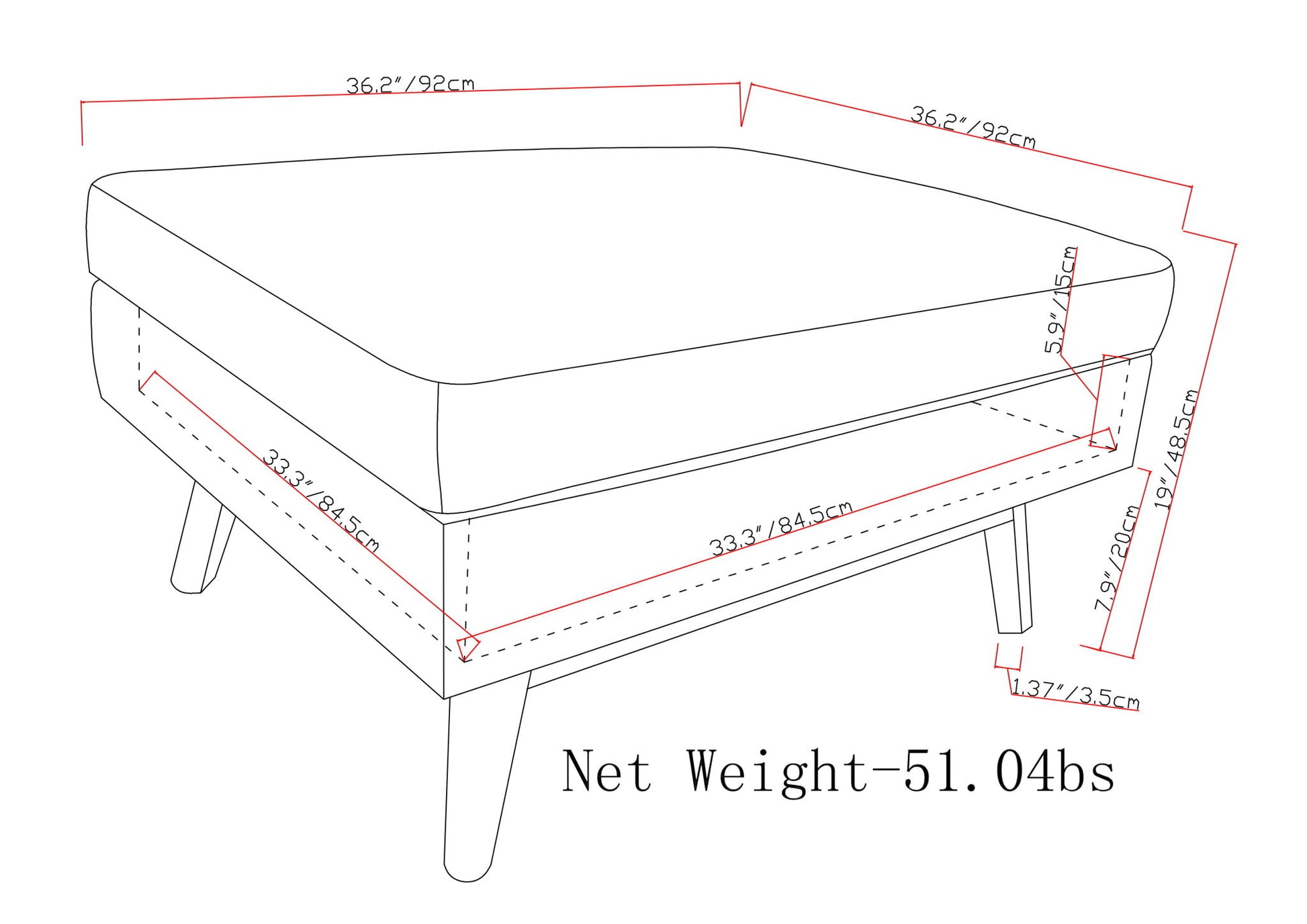 35.8"W x 35.8"D x 19.3"H - 47.2 lb