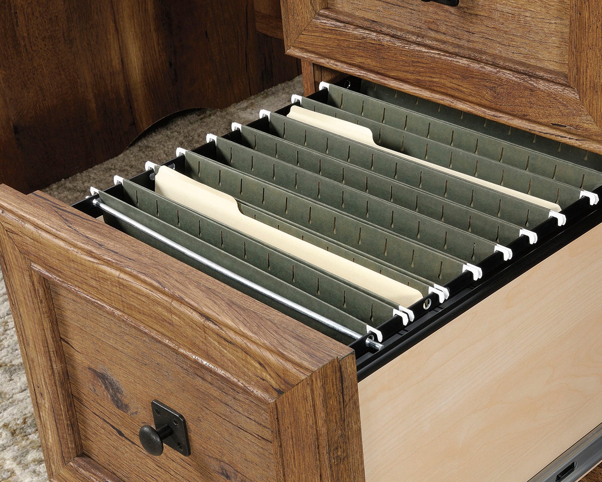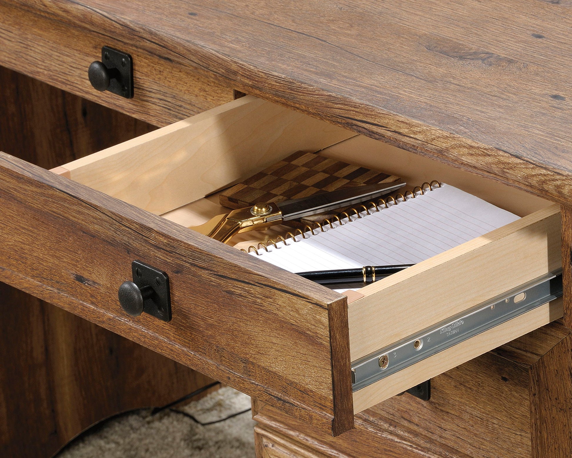 Give your office a promotion with this executive desk from the Palladia collection. This home office desk features a spacious work surface that provides room for all your office essentials. A large drawer/shelf with a flip-down panel for your keyboard/mouse or laptop ensures that the top of your double pedestal desk is free of unnecessary clutter and leaves more room for photos of your family, a lamp, and your cup of coffee. This executive home office desk features two pencil drawers and two storage drawers that all open and close on smooth metal runners for optimal office storage space. The lower file drawers with full extension slides hold letter, legal or European size hanging files. This computer desk with drawers includes a cord management system with two desktop grommets, numerous pass-throughs, and a pedestal with a hinged panel for easy access to battle against unwanted cord clutter. Finished in Vintage Oak, this stylish executive office desk will have you feeling like an executive.