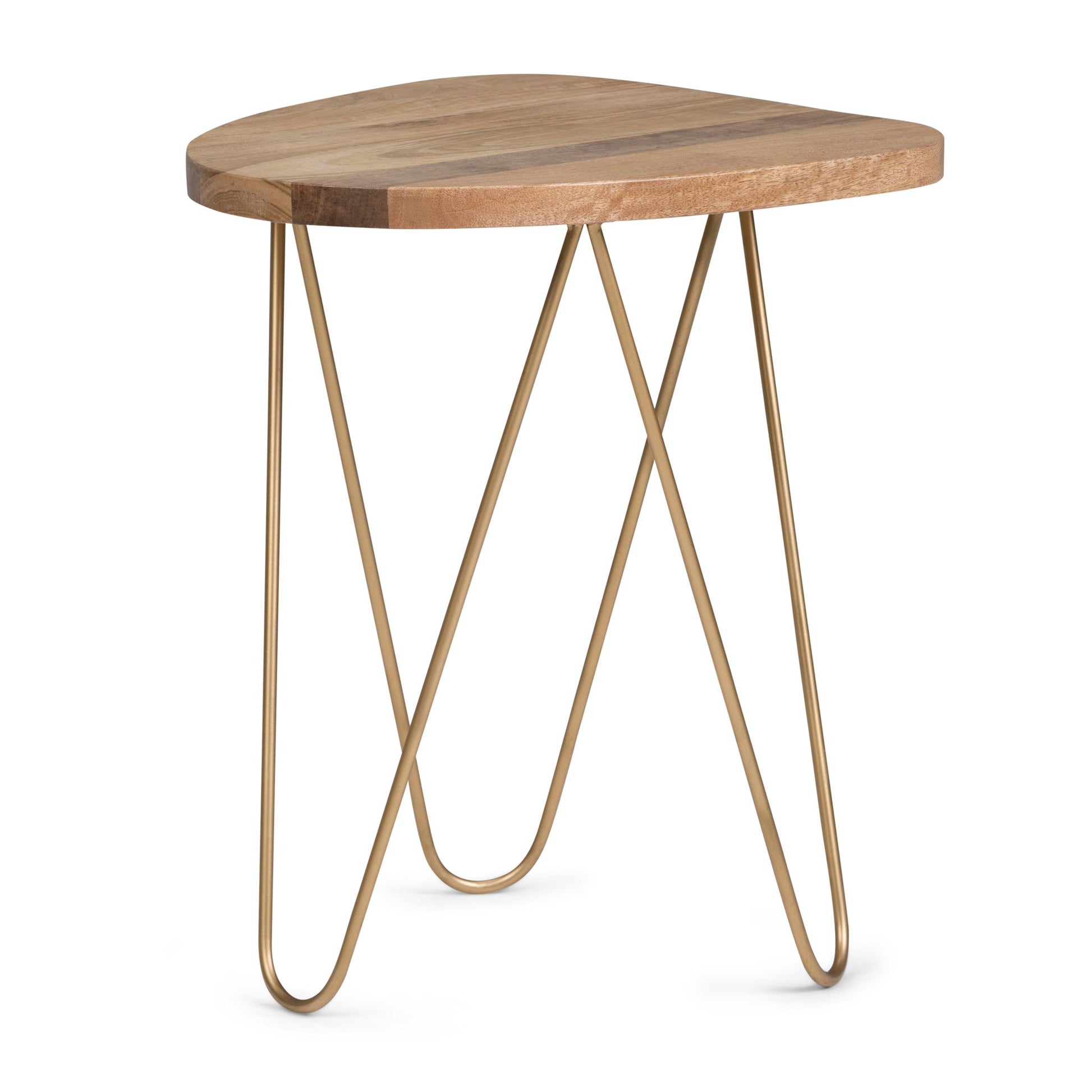 - Features unique shaped solid wood top and gold metal hairpin legs