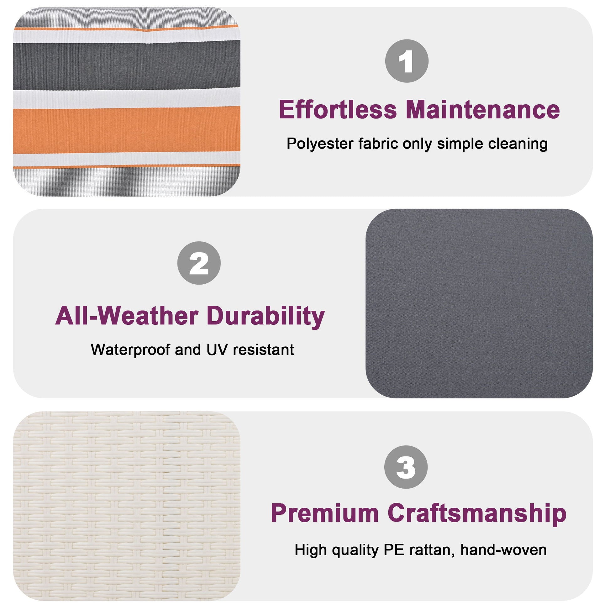 - All-Weather Durability: Hand-woven PE rattan and water-repellent polyester covers make this swing resilient against the elements, ensuring long-lasting use.