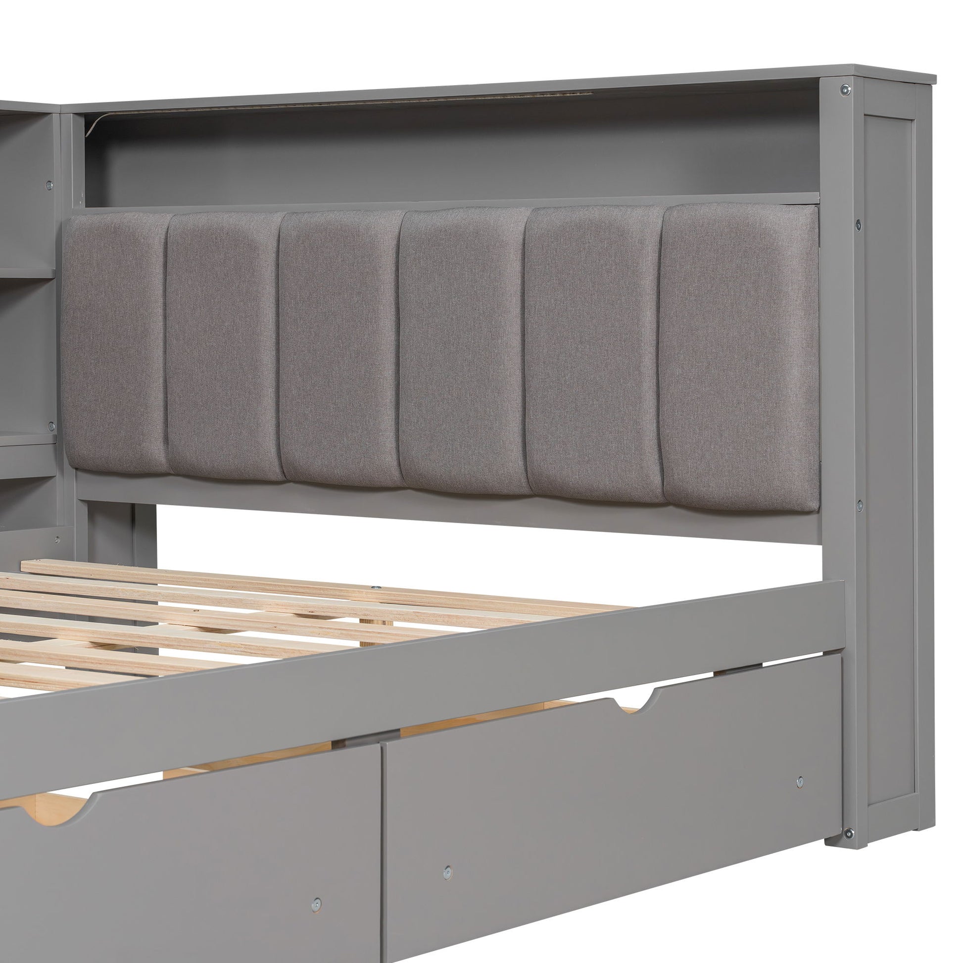 Full Size Platform Bed With Upholstered Headboard, Storage Shelves, Drawers, Charging Station, LED Lighting, Built In Desk - Gray