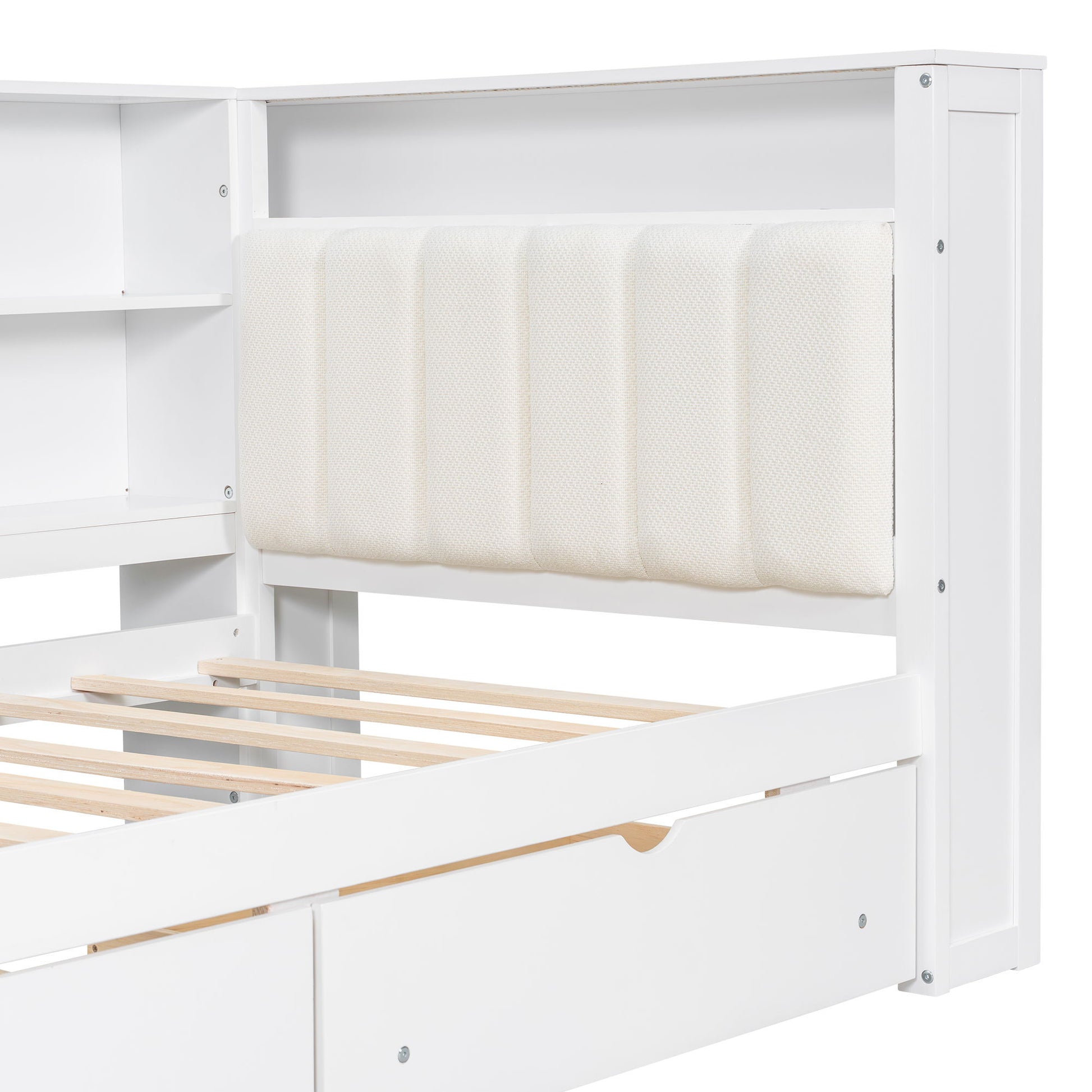 Twin Size Platform Bed With Upholstered Headboard, Storage Shelves, Drawers, Charging Station, LED Lighting, Built In Desk - Beige / White