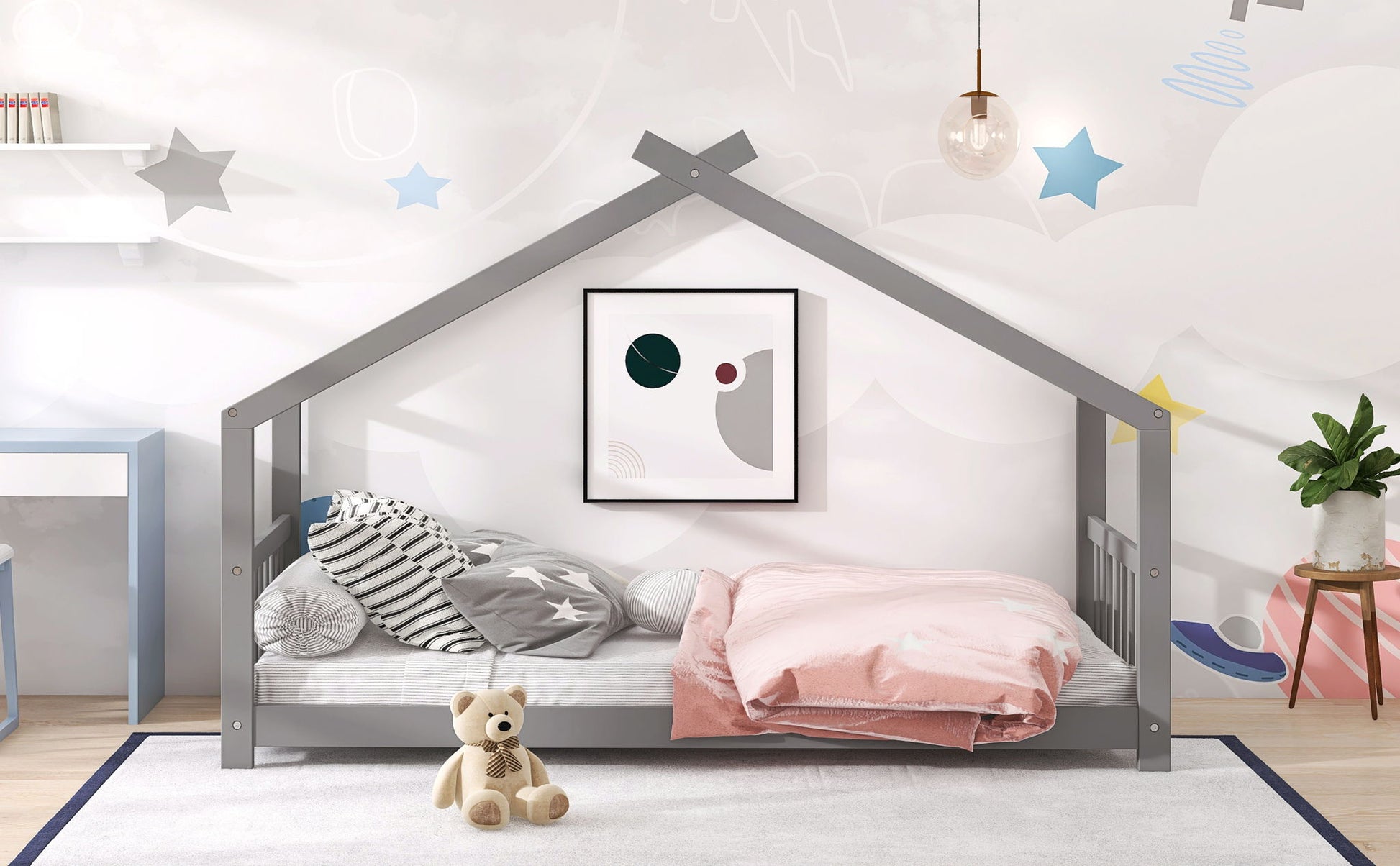 - Playhouse Design: This house bed features a charming roof design, creating an engaging and delightful space for children. It serves as both a cozy sleeping area and a playful environment for kids to enjoy and have fun.