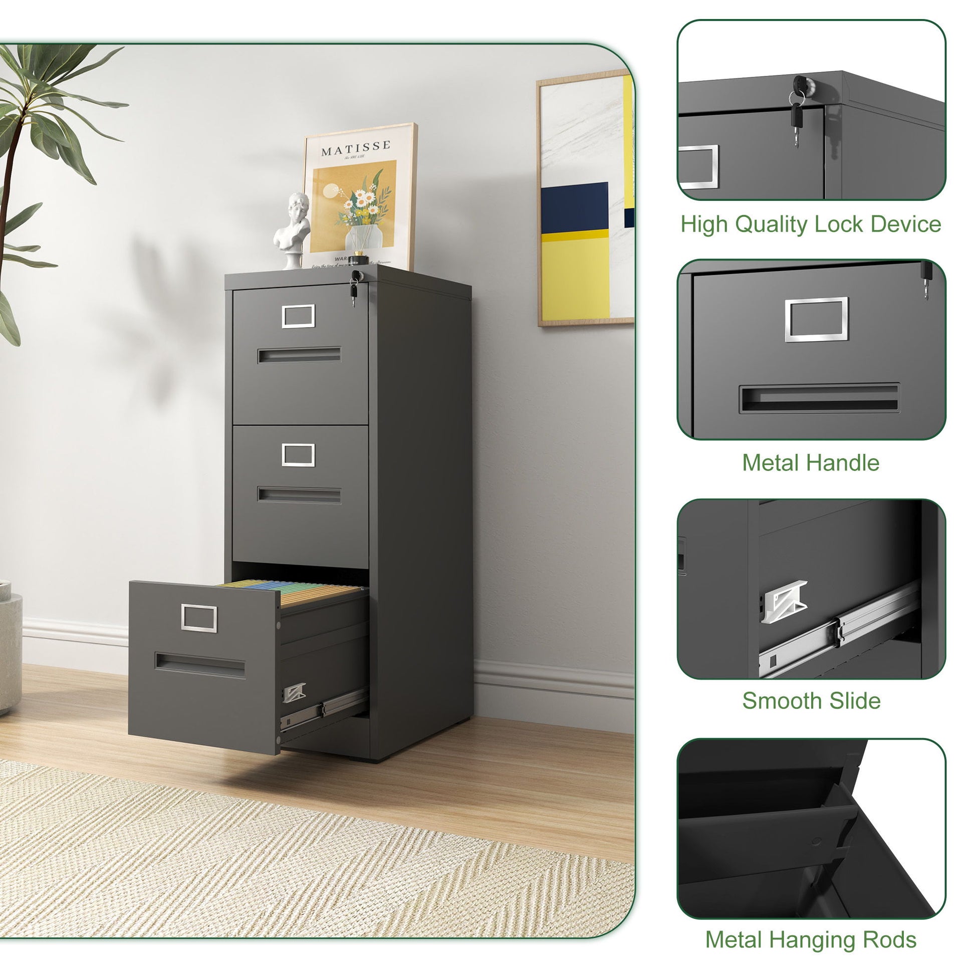 Premium Metal Vertical 3 Drawer File Cabinet With Lock For A4 Legal / Letter Size Documents, Steel - Gunmetal Black
