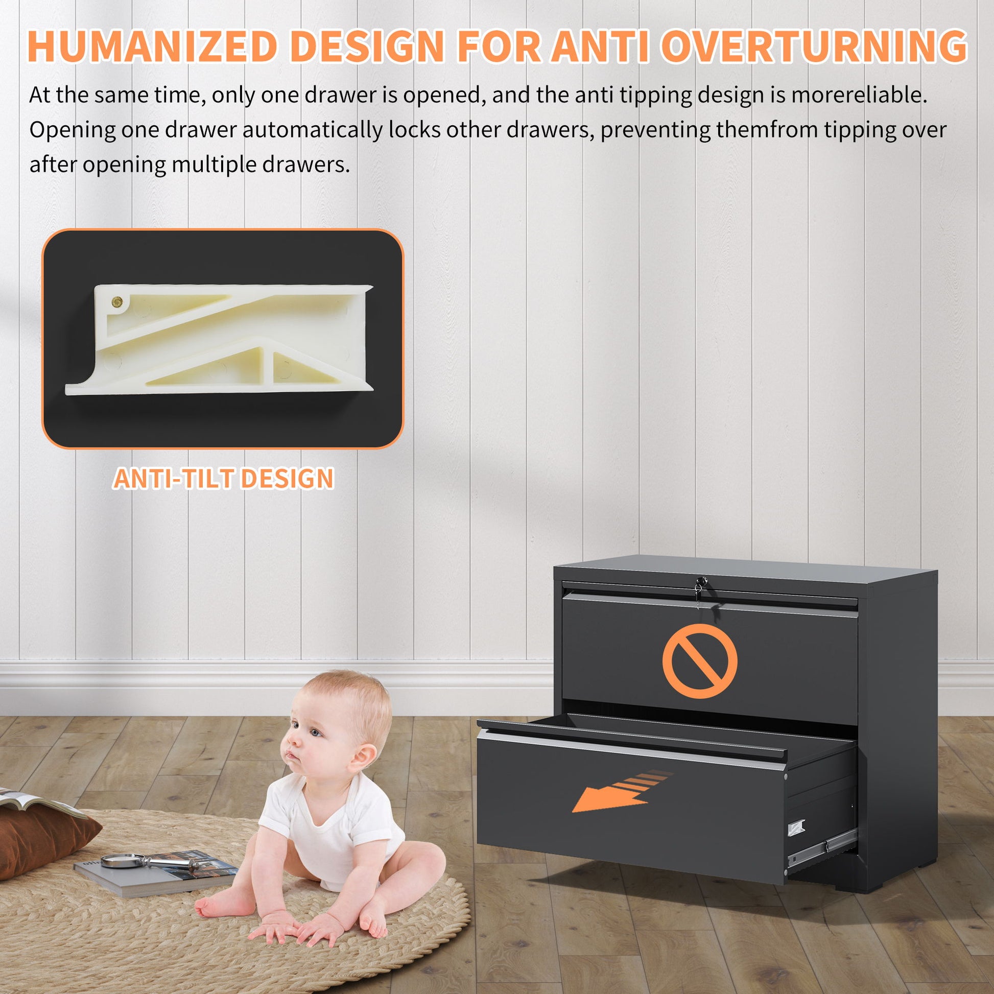 Premium 2 Drawer Metal Lateral File Cabinet With Lock Steel Wide Horizontal Filing Cabinets For Home Office - Black