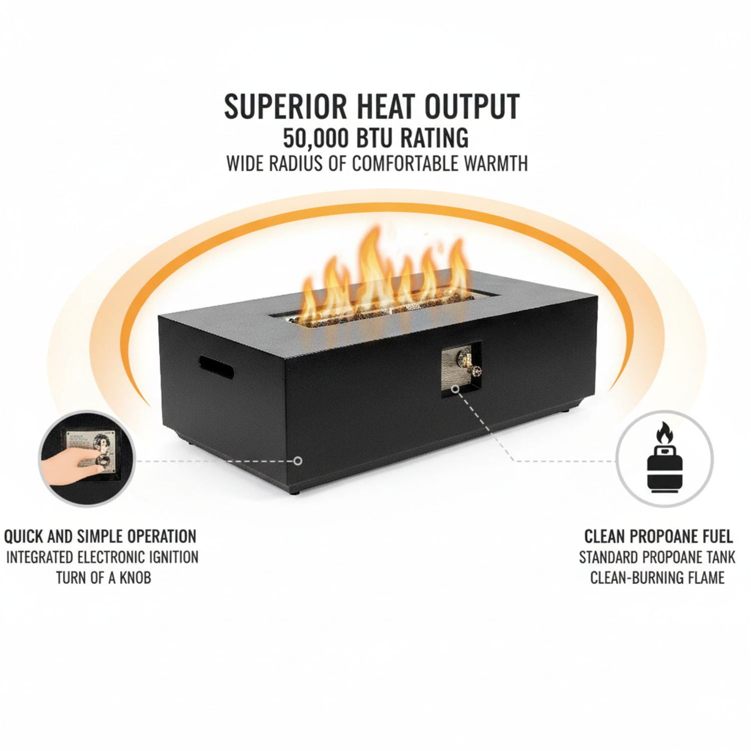 - Powerful Heat Output: Produces up to 50,000 BTUs, keeping you warm during cool evenings and year-round gatherings.