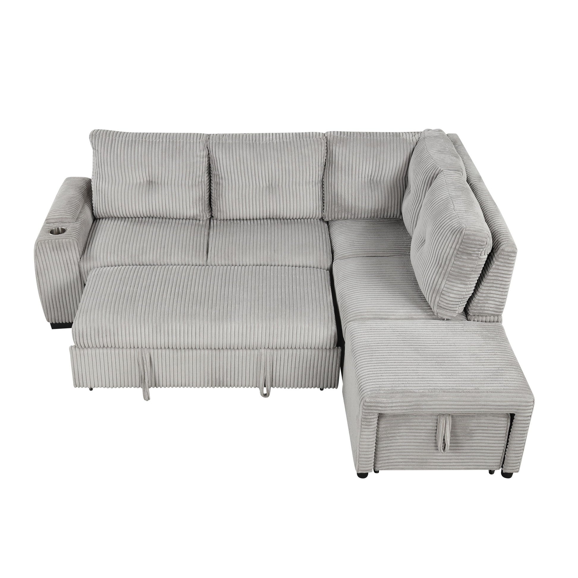 Pull-Out L-Shaped Sectional Sofa With Movable Ottoman And Stool, Large Storage Space, A Cup Holder, And 2 USB Ports For Living Room