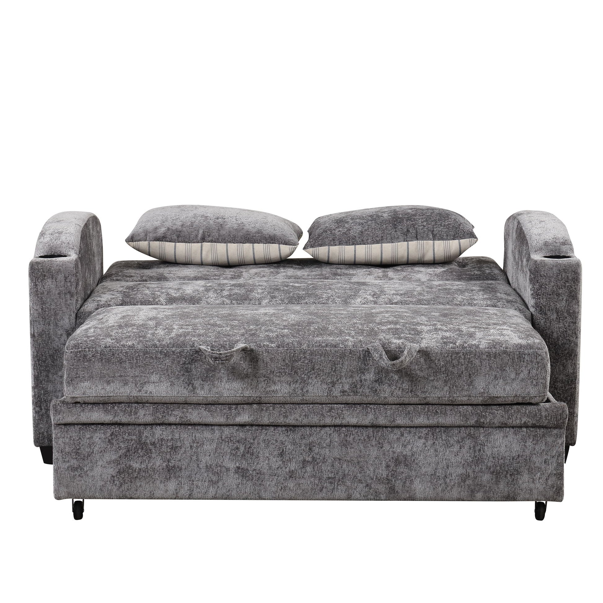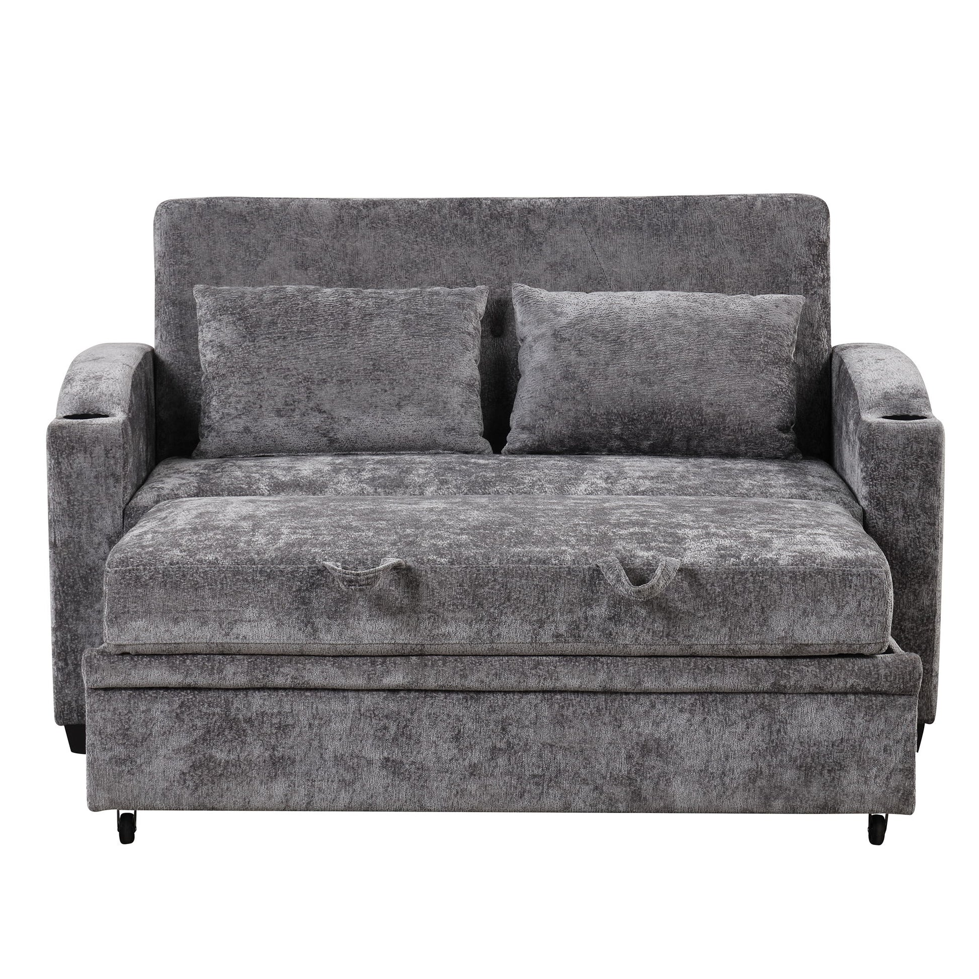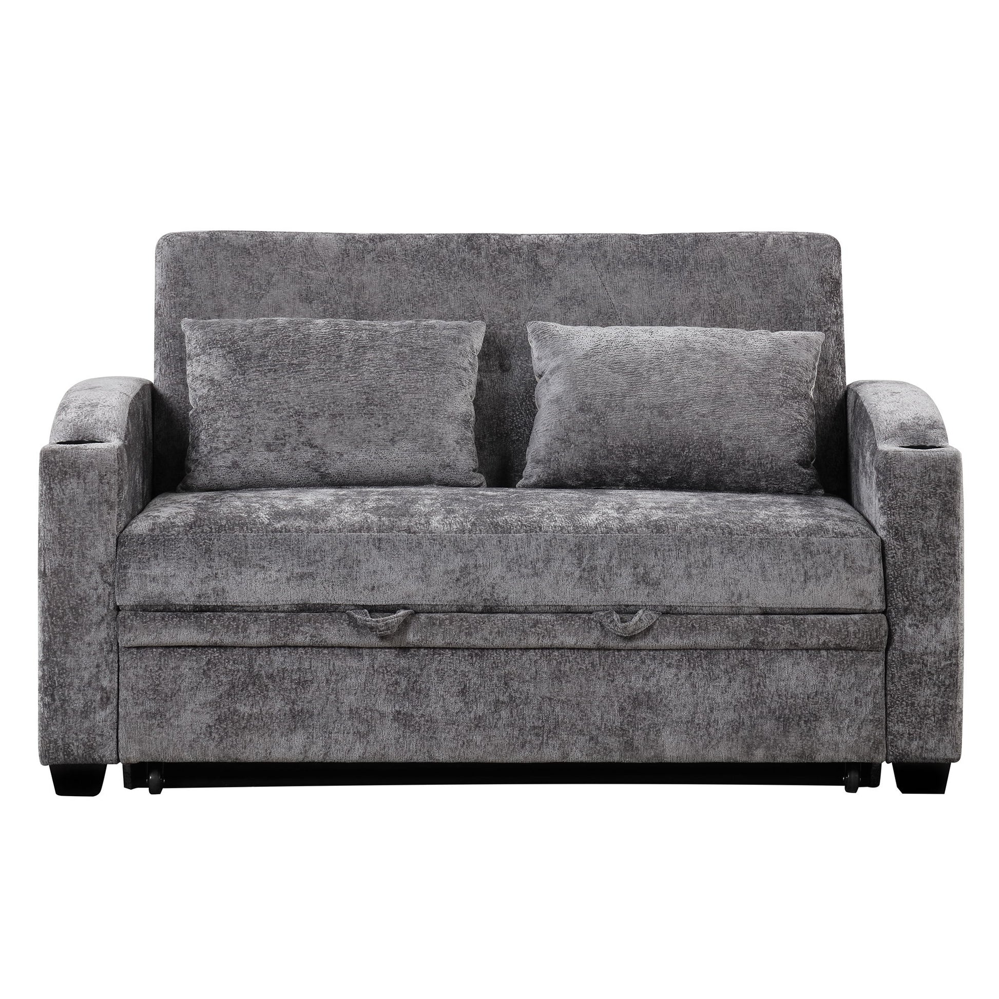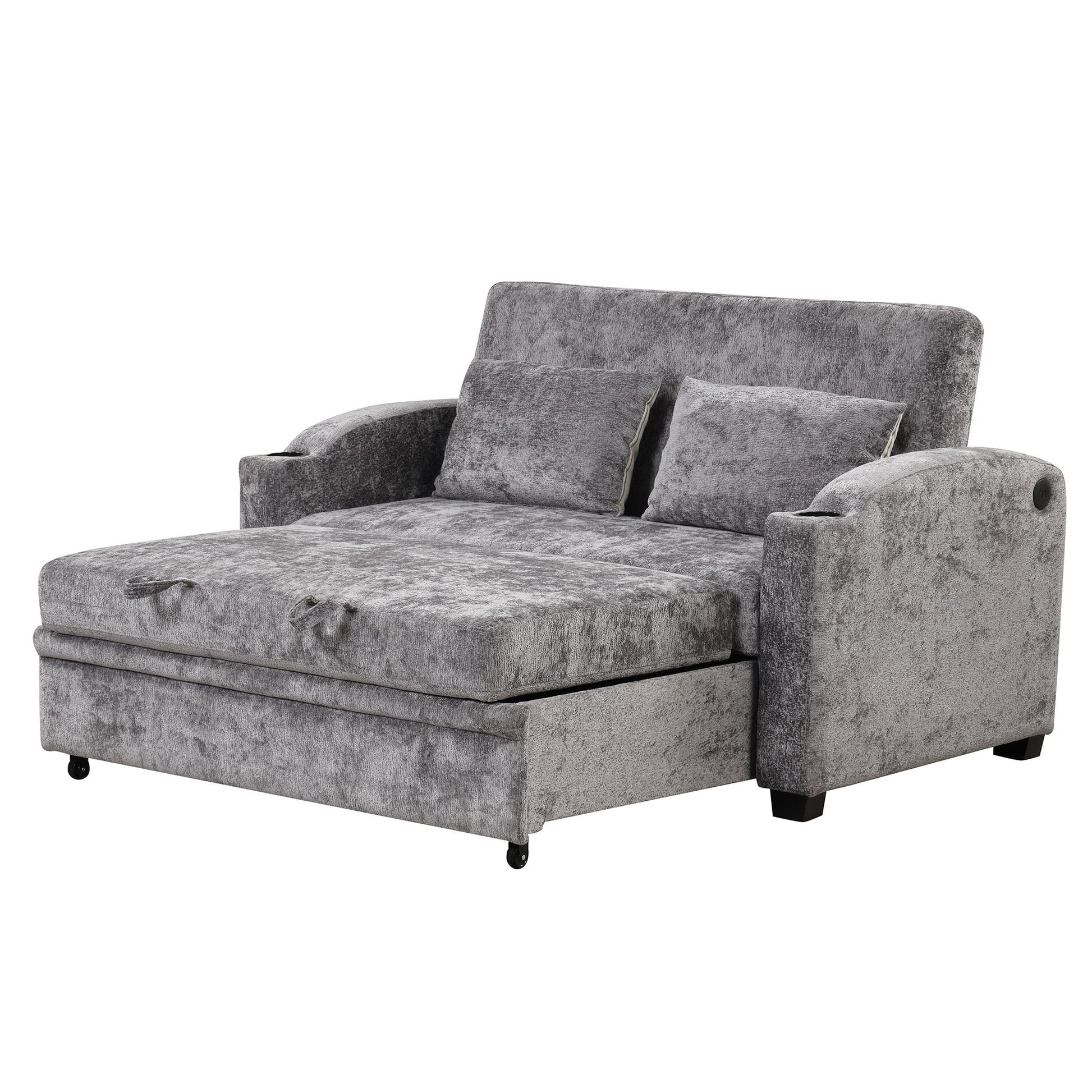 Pull Out Sofa Bed Modern Chenille Convertible Loveseat Sofa With Adjsutable Backrest, 2 Pillows, Cup Holders, USB Ports For Living Room, Apartment - Gray