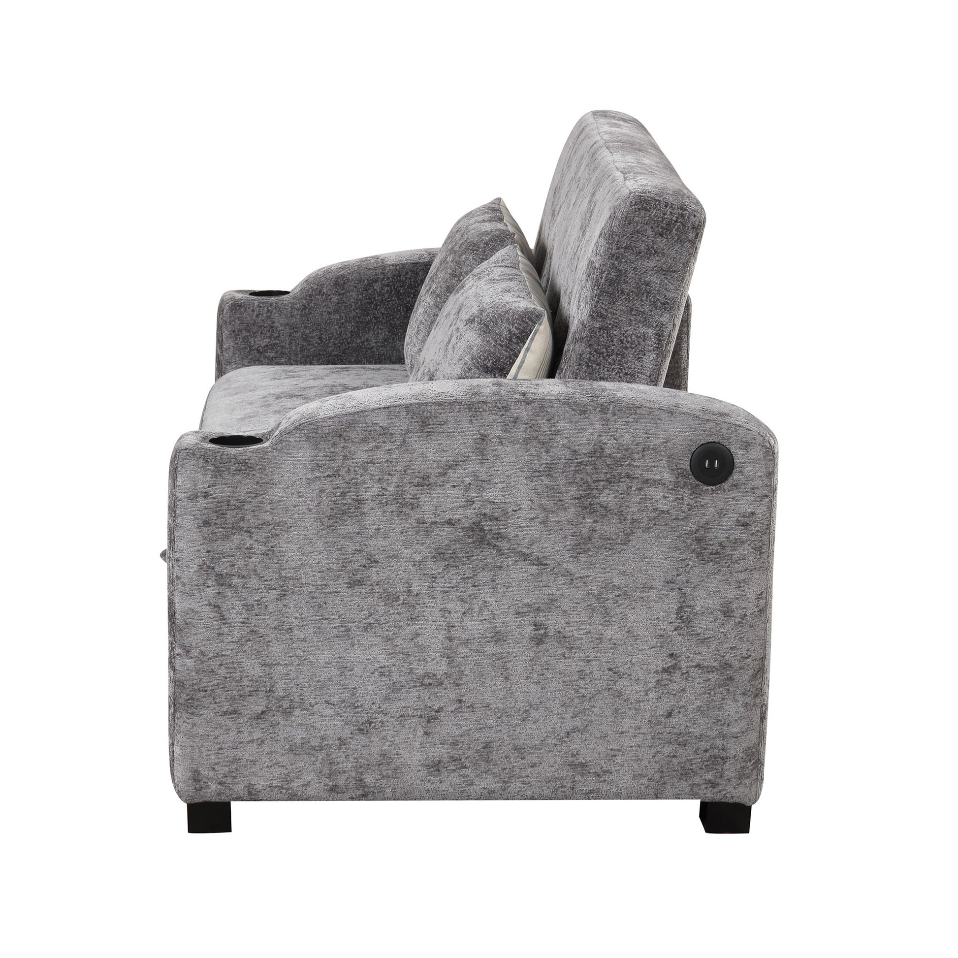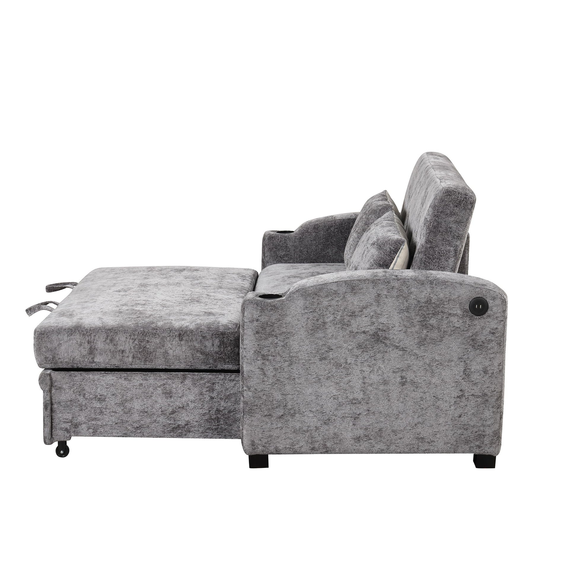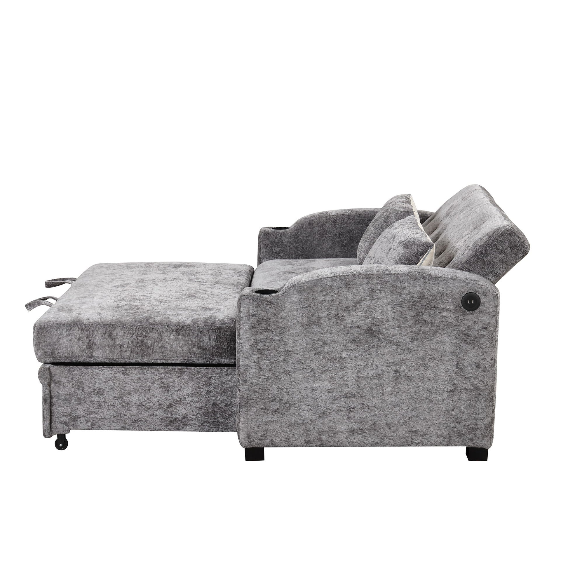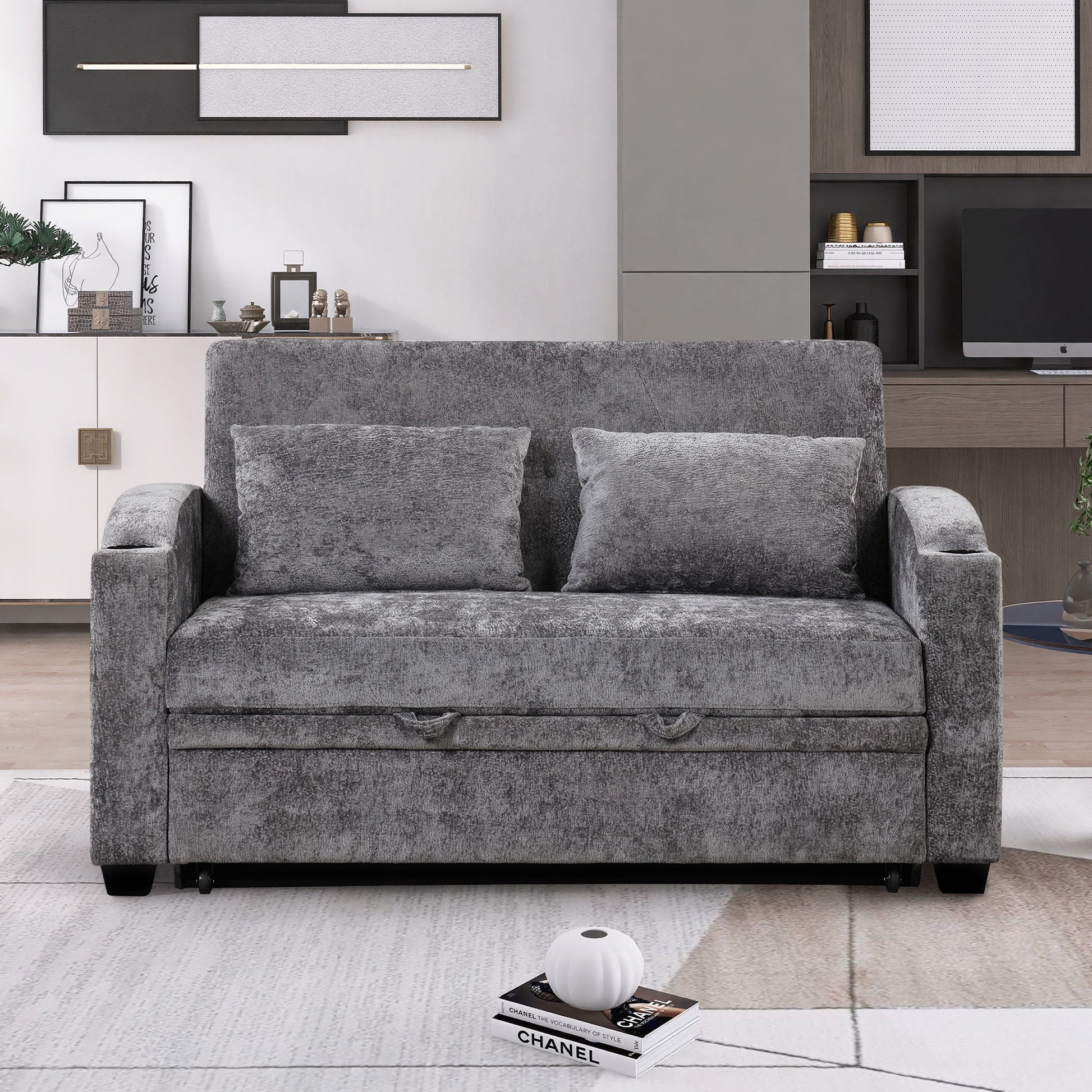 Pull Out Sofa Bed Modern Chenille Convertible Loveseat Sofa With Adjsutable Backrest, 2 Pillows, Cup Holders, USB Ports For Living Room, Apartment - Gray