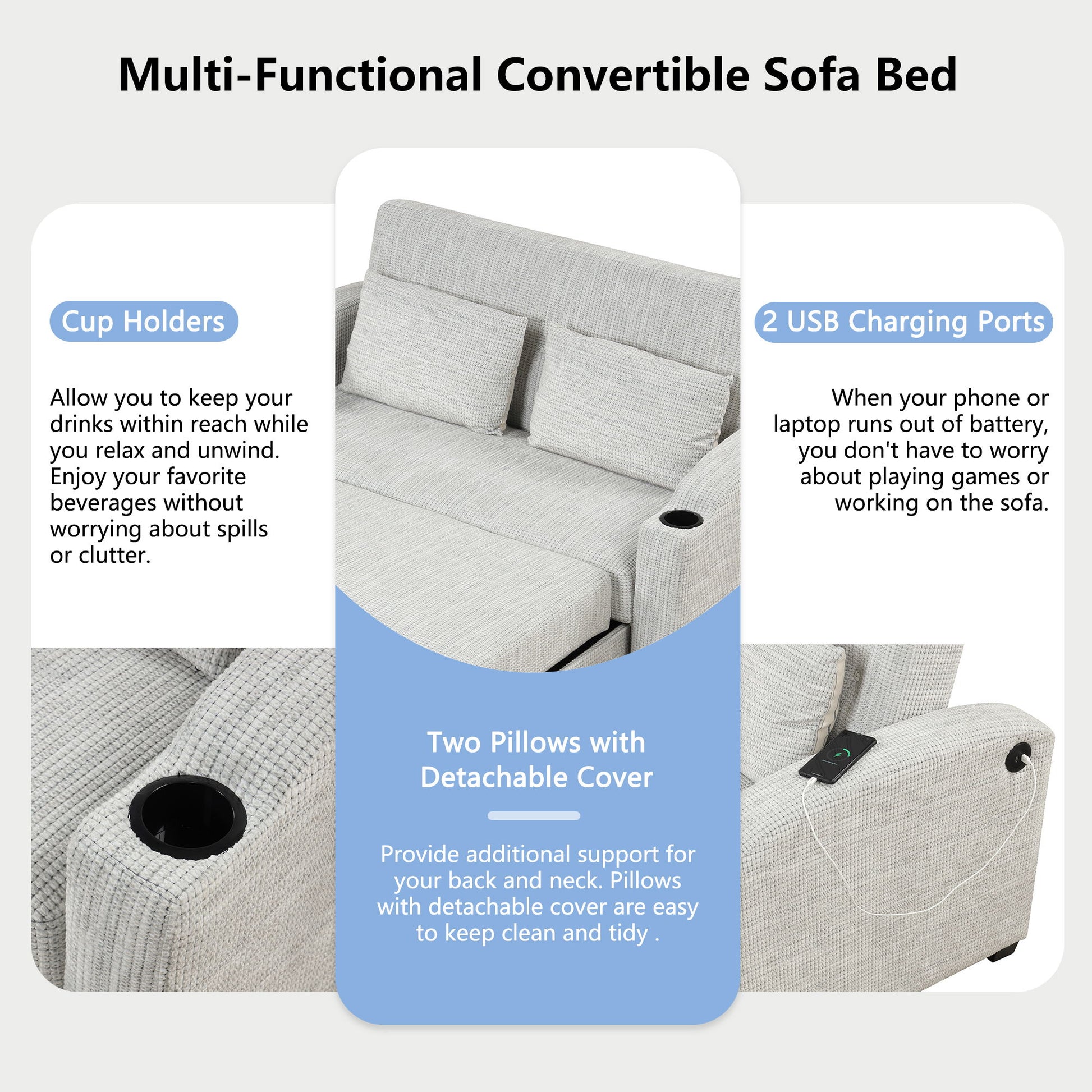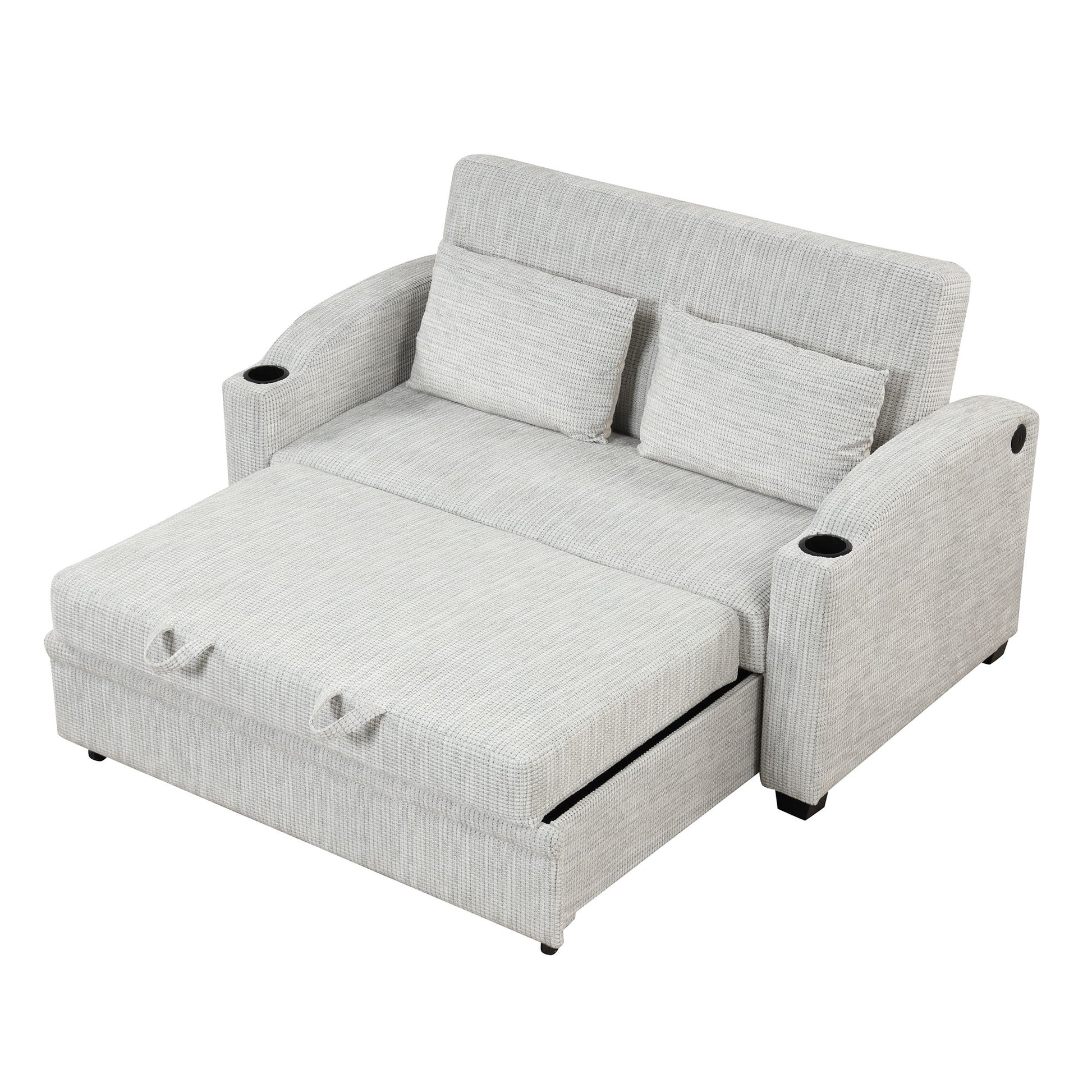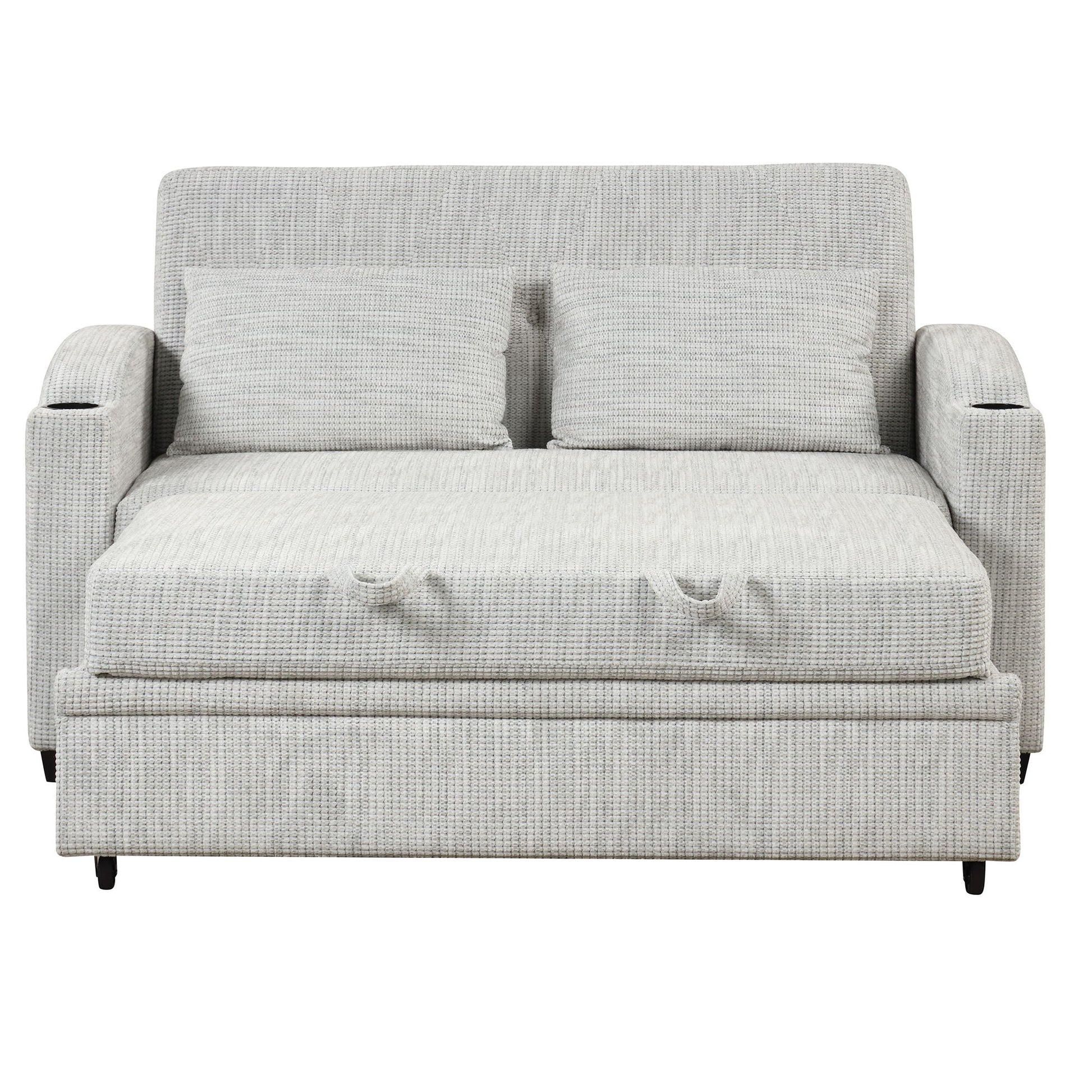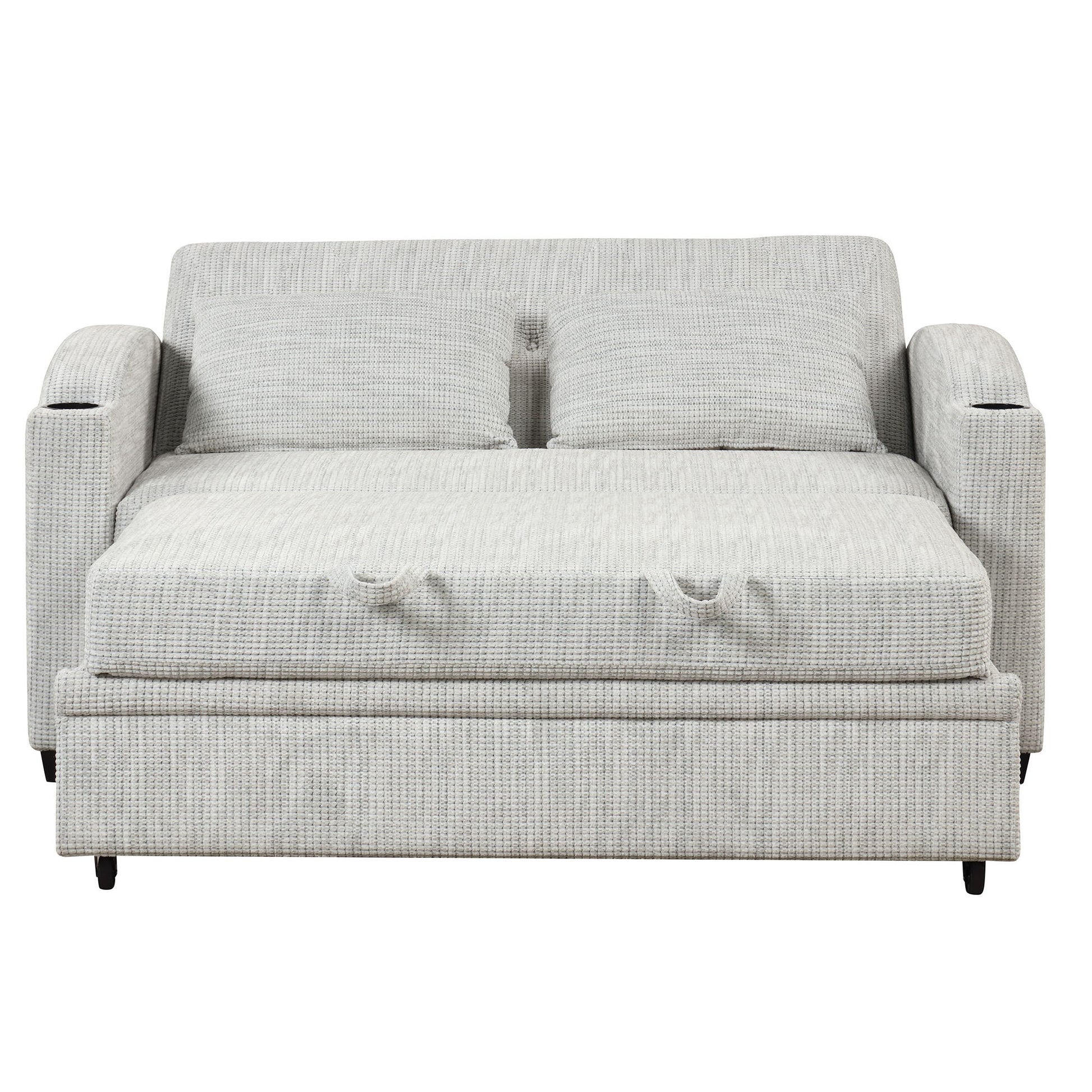 Pull Out Sofa Bed Modern Chenille Convertible Loveseat Sofa With Adjsutable Backrest, 2 Pillows, Cup Holders, USB Ports For Living Room, Apartment - White / Gray