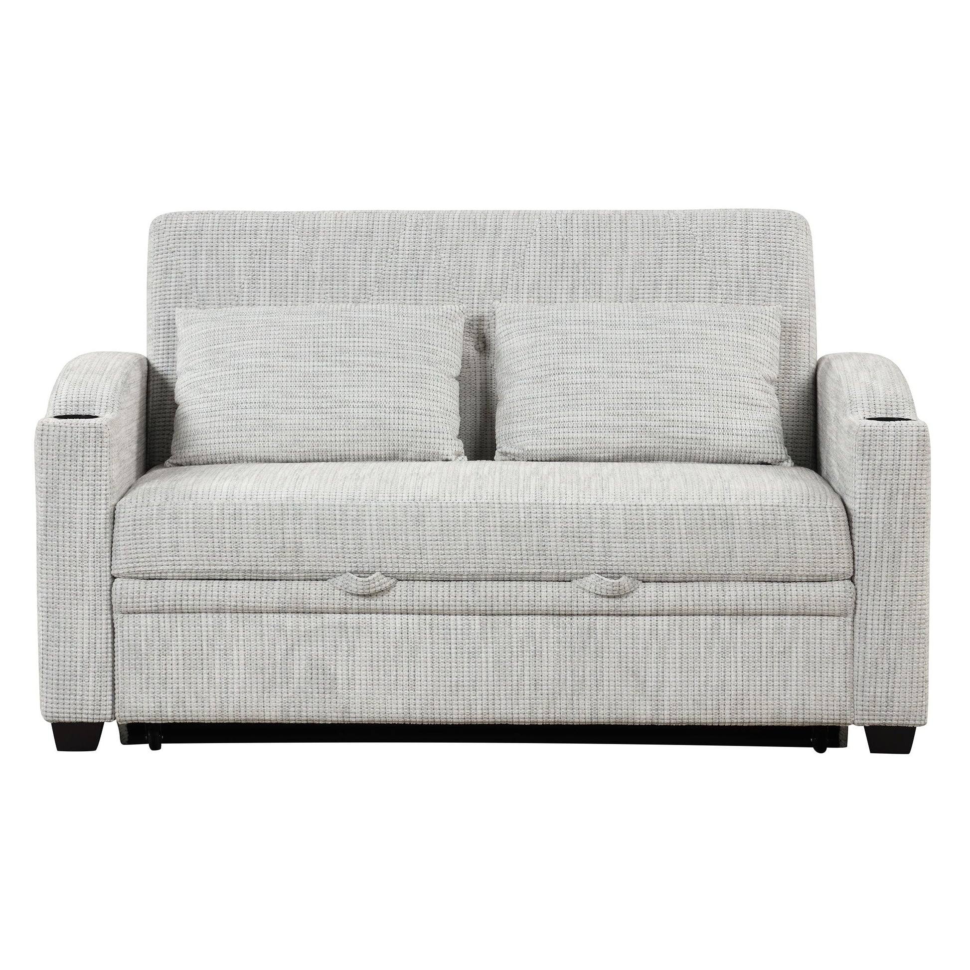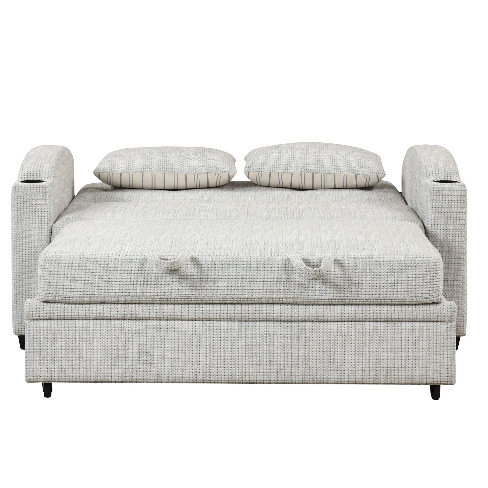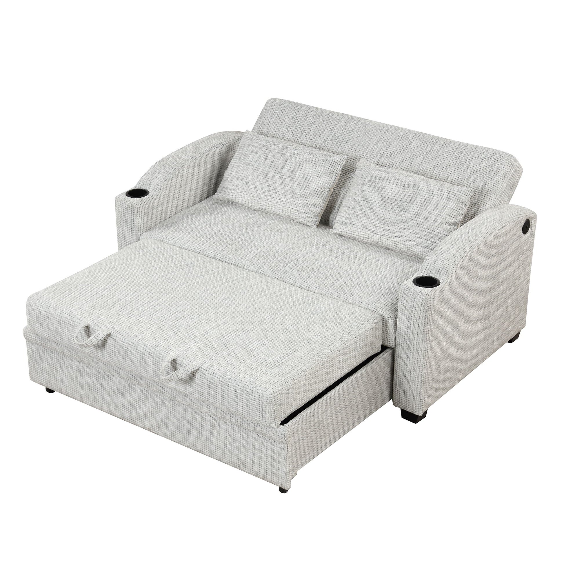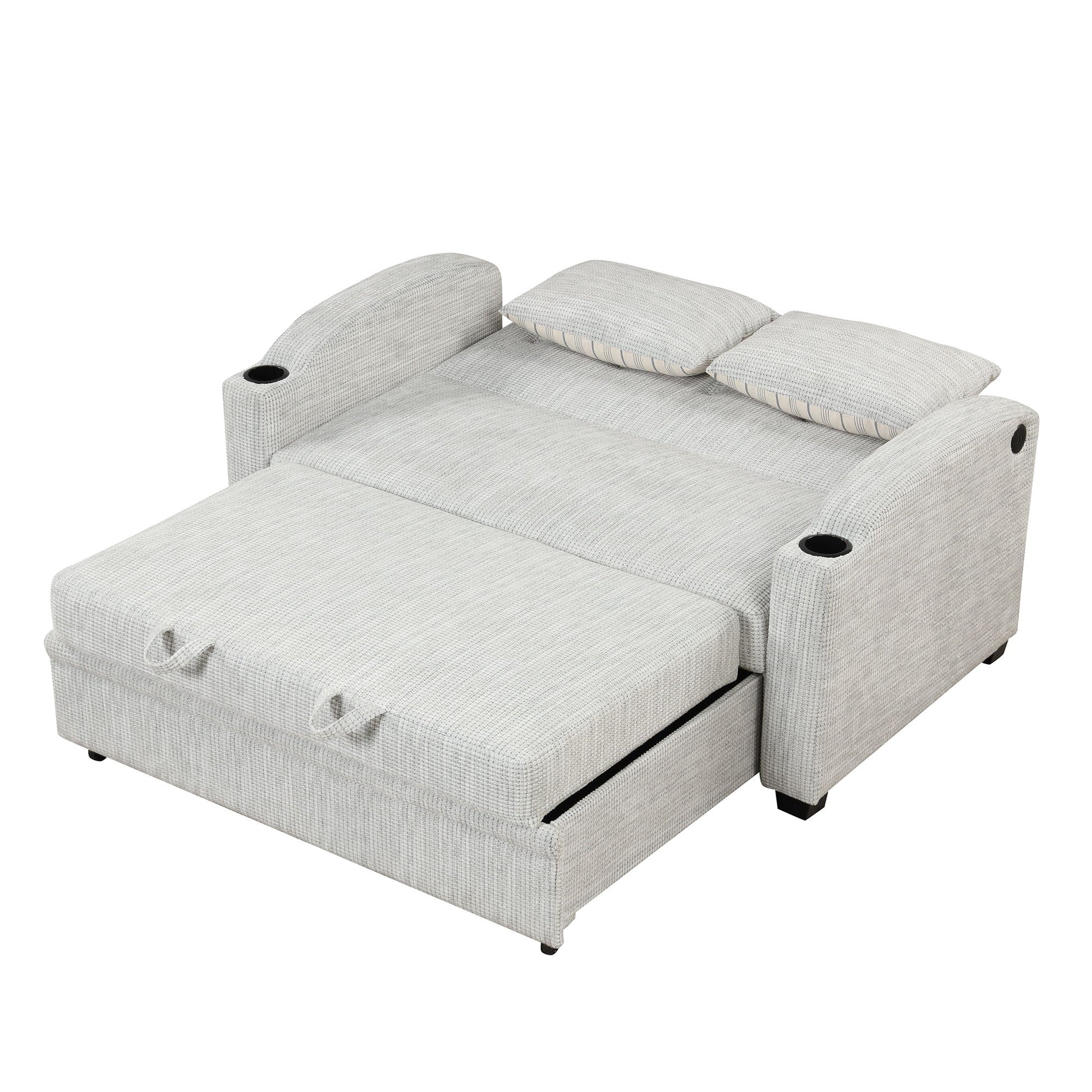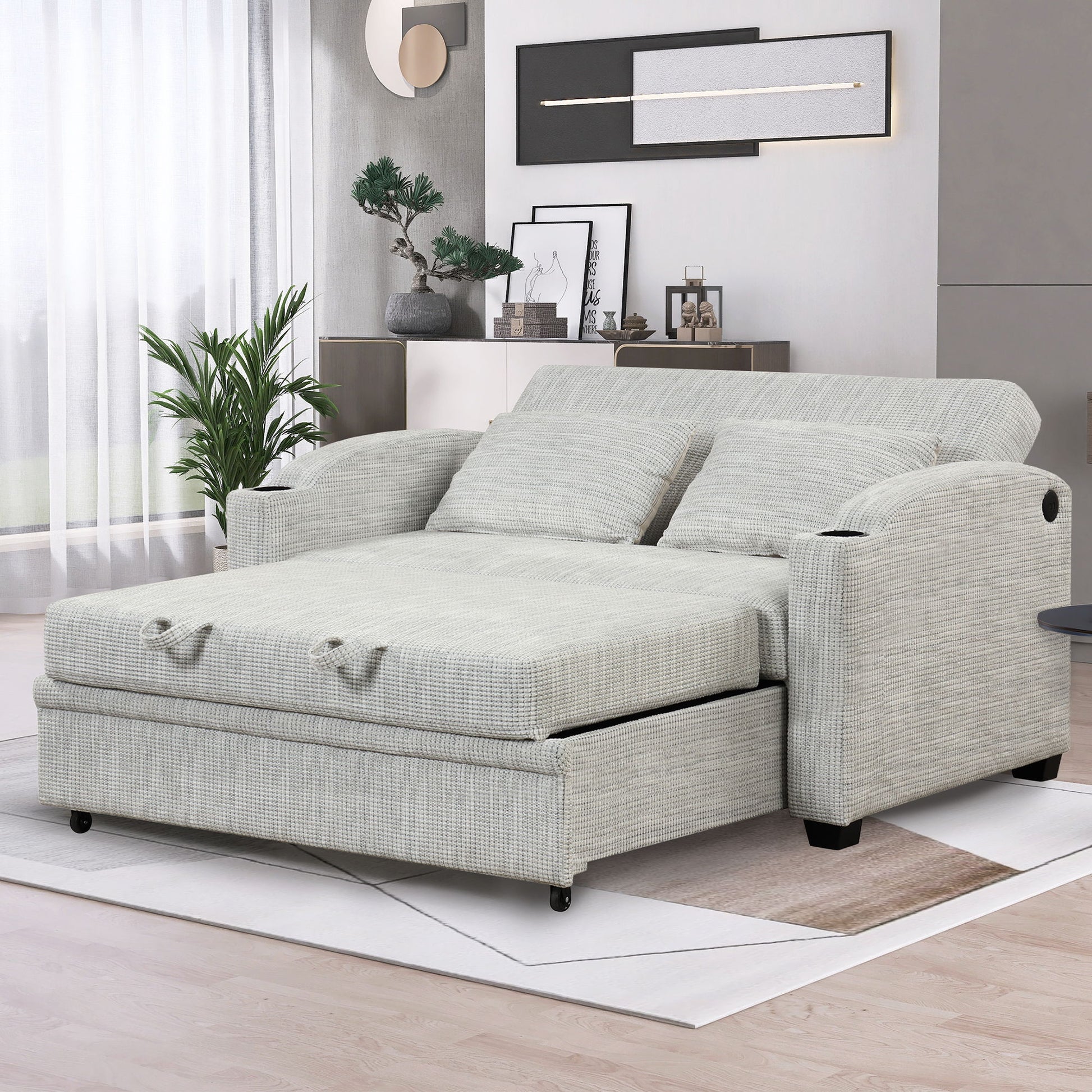 Pull Out Sofa Bed Modern Chenille Convertible Loveseat Sofa With Adjsutable Backrest, 2 Pillows, Cup Holders, USB Ports For Living Room, Apartment - White / Gray