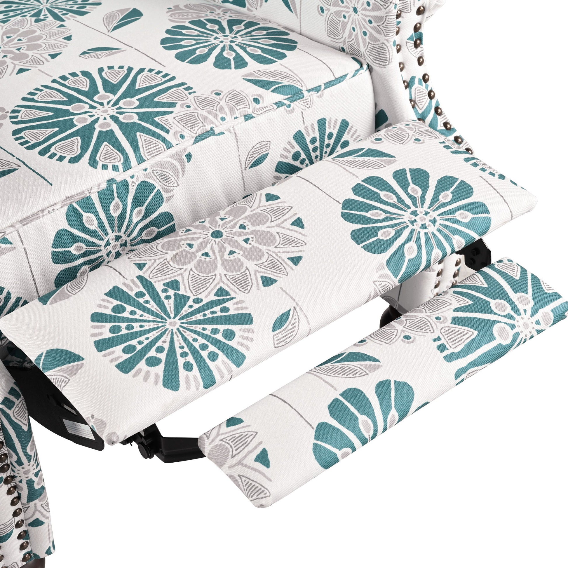 Push Back Recliner Chair Upholstered With Classic Wing Back And Solid Gourd-Shaped Legs For Living Room - White / Blue