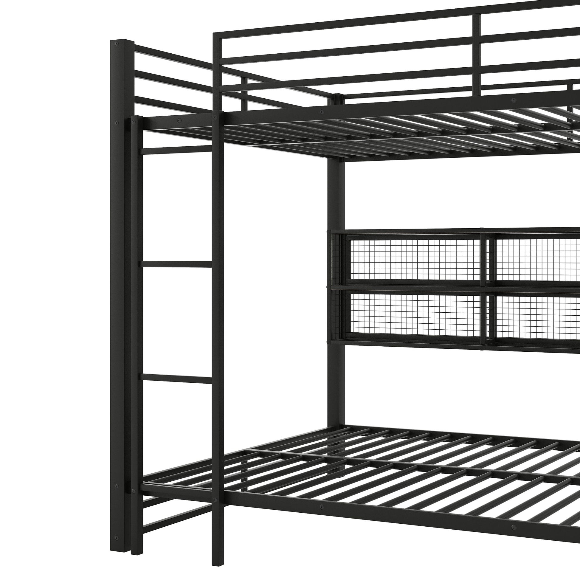 Queen Over Queen Bunk Bed With Storage Cabinets And LED Sturdy Frame, 6 Storage Units, Adjustable LED Lights - Black