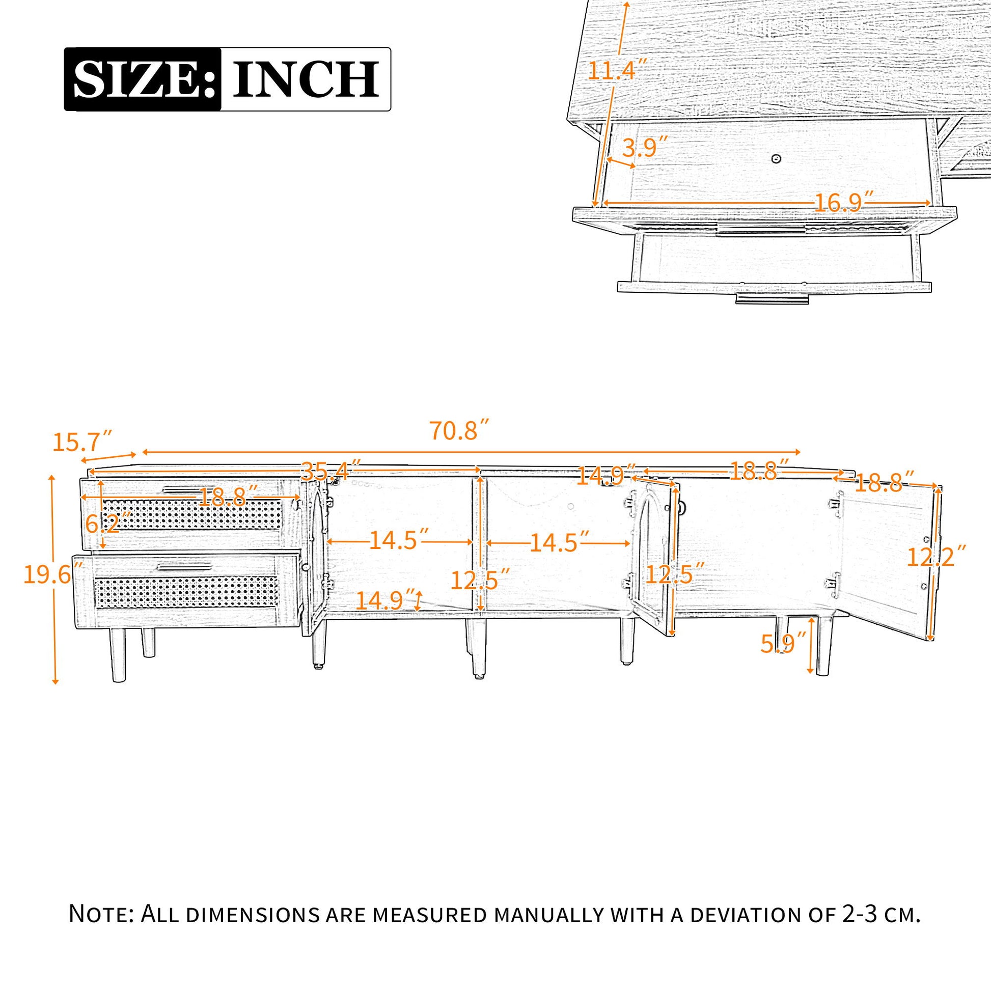 - TV Compatibility: This TV stand accommodates TVs up to 80 inches, with dimensions of 70.8'' L x 15.7'' W x 19.6'' H, fitting most TV models available in the market.