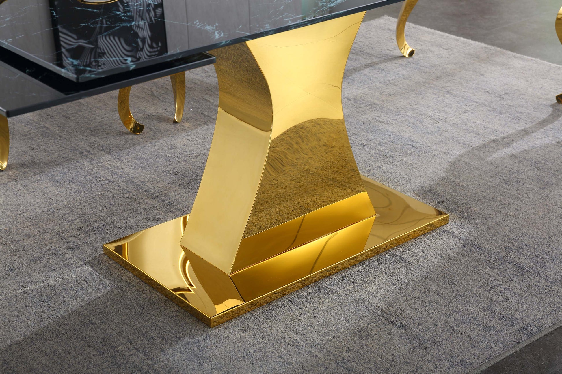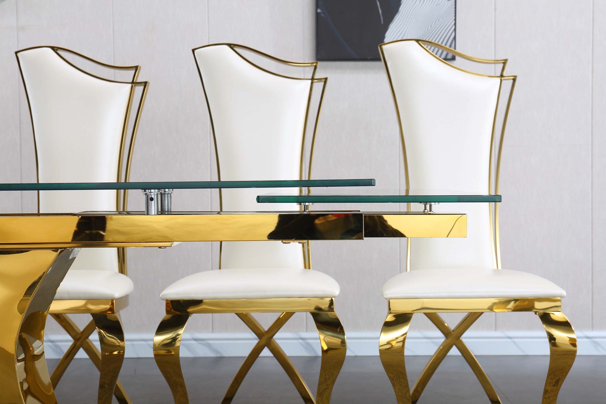 Elevate your dining experience with this sophisticated extendable dining table, designed to seamlessly blend functionality and luxury. The stunning 12mm tempered glass top is available in clear glass or printed black marble, adding an elegant touch to any dining space. The stainless steel base, available in a gold or silver mirrored finish, provides both durability and a modern aesthetic. With its extendable design, this table can accommodate more guests, making it perfect for both intimate dinners and larger gatherings. Measuring 63"L and extending to 94.5"L, this table offers ample space for all your dining needs.