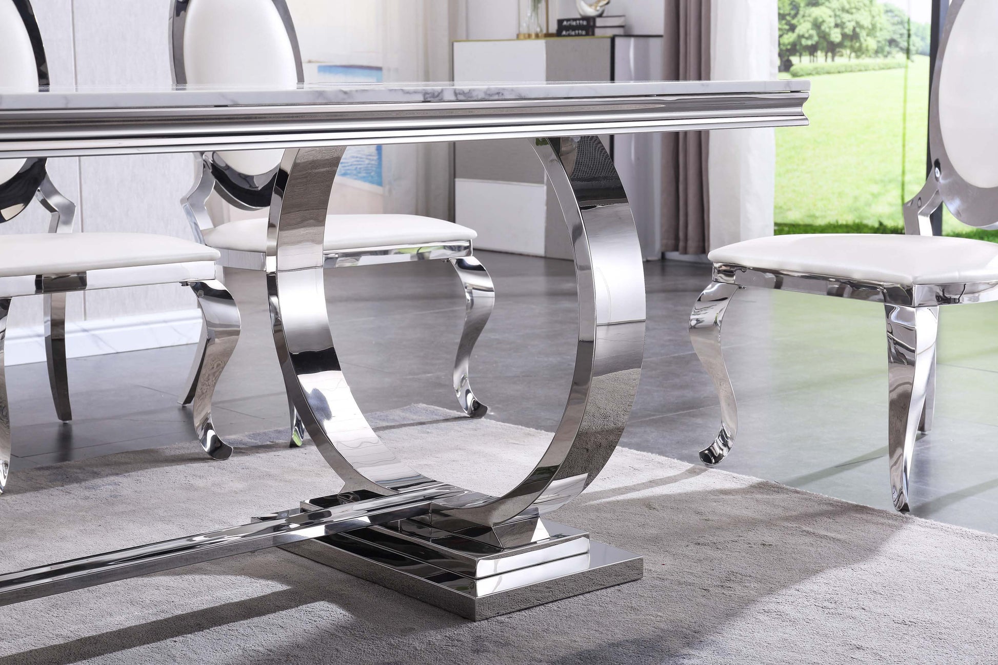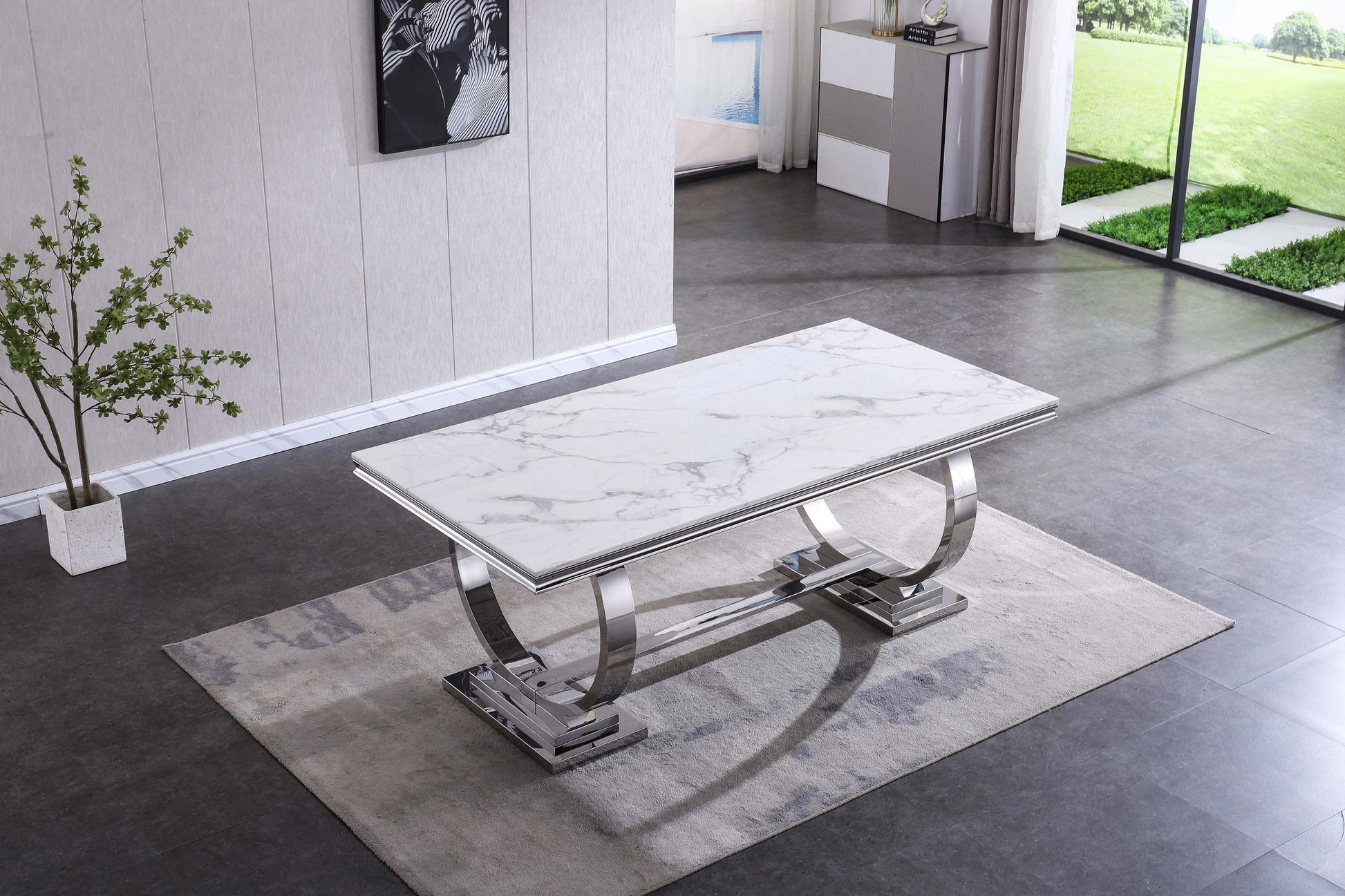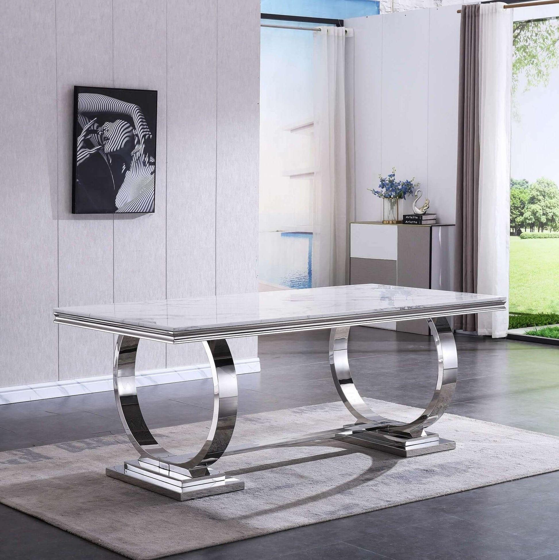 Elevate your dining experience with this luxurious rectangular dining table, featuring an 18mm white or black marble top for a touch of timeless elegance. Supported by a durable stainless steel base with your choice of a gold or silver mirrored finish, this table is perfect for family gatherings, dinner parties, or everyday meals. With its spacious design, it provides ample room for up to 8 guests. Assembly is required, but the stunning result will elevate your dining area for years to come.