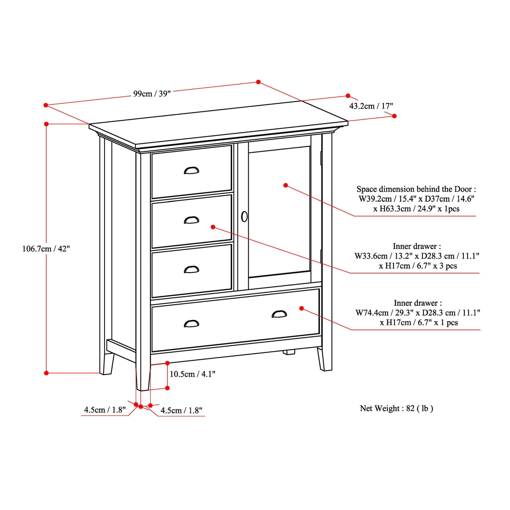 - Dimensions: 17" D x 39" W x 42" H
