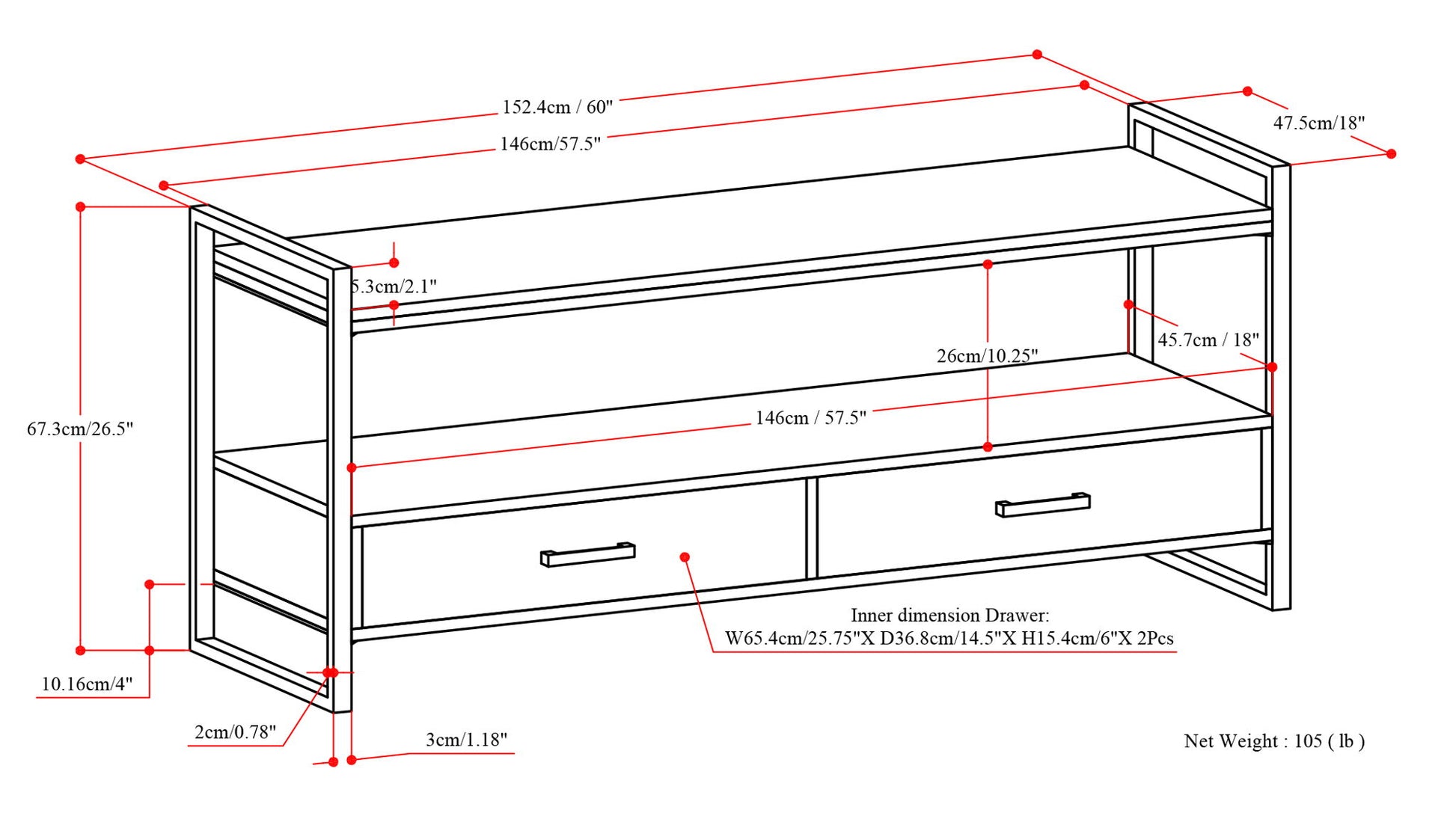 60.0"W x 18.1"D x 26.0"H - 101.6 lb