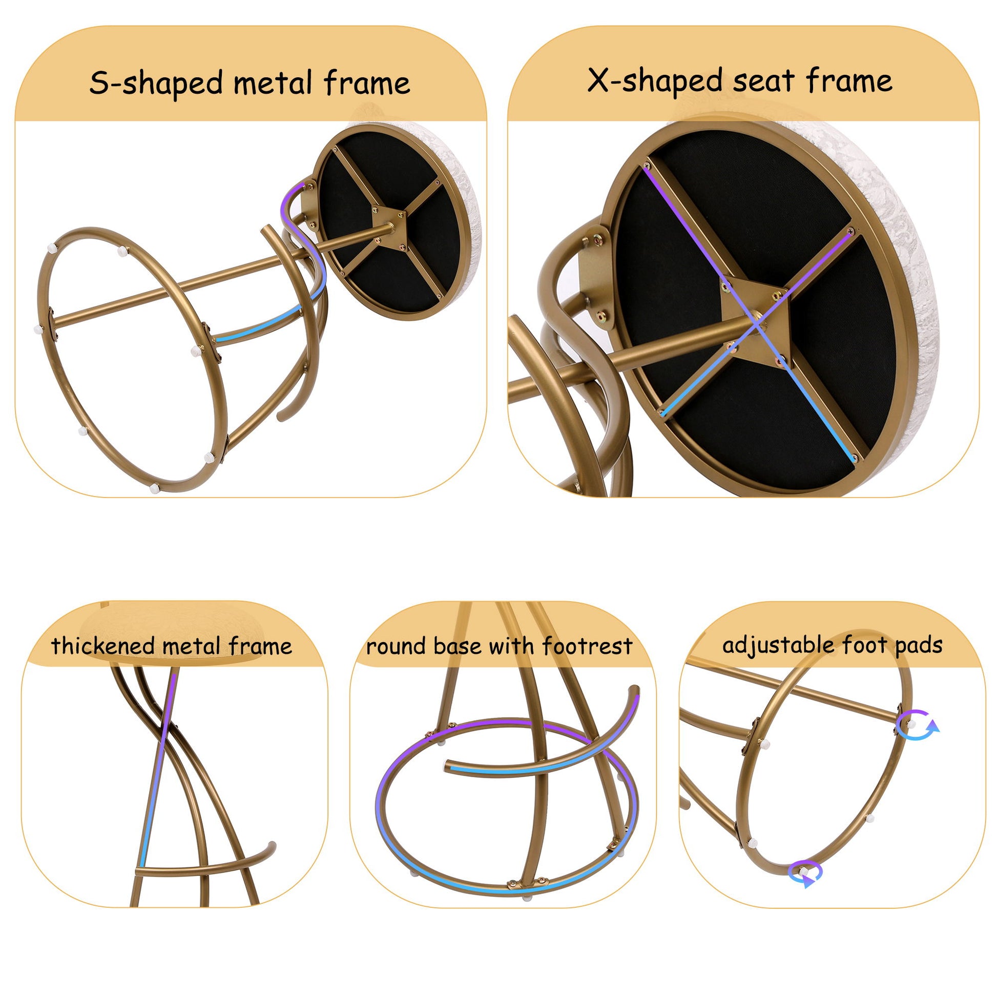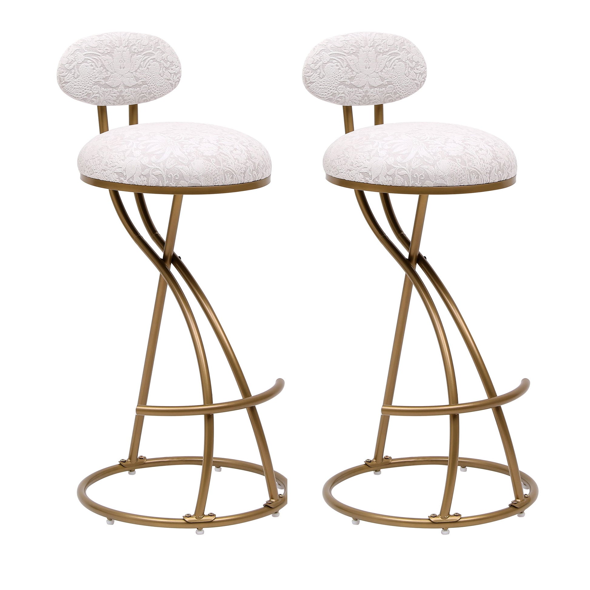 Modern S Shaped Bar Stools (Set of 2) With Backrest Floral Print Upholstered Dining Chairs Counter Height For Kitchen Island - Gold & White Print