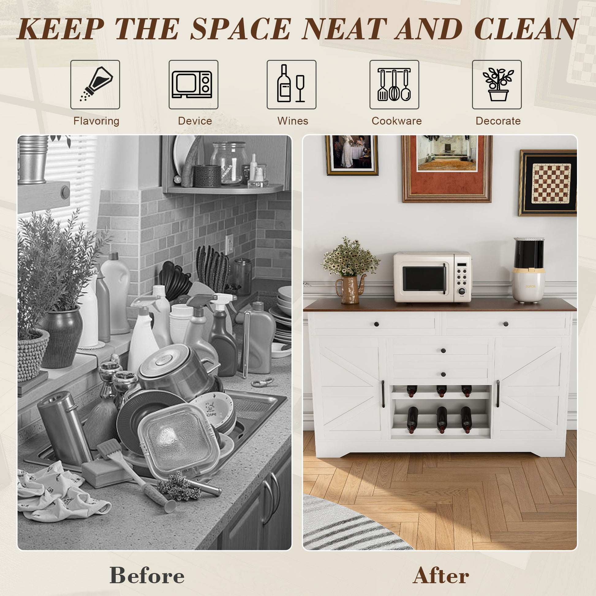- Ample & Smart Storage: Stay organized with four spacious drawers and two cabinetsperfect for storing cutlery, cookware, and small appliances. Features a dedicated wine rack that holds up to 6 bottles of your favorite vintages.