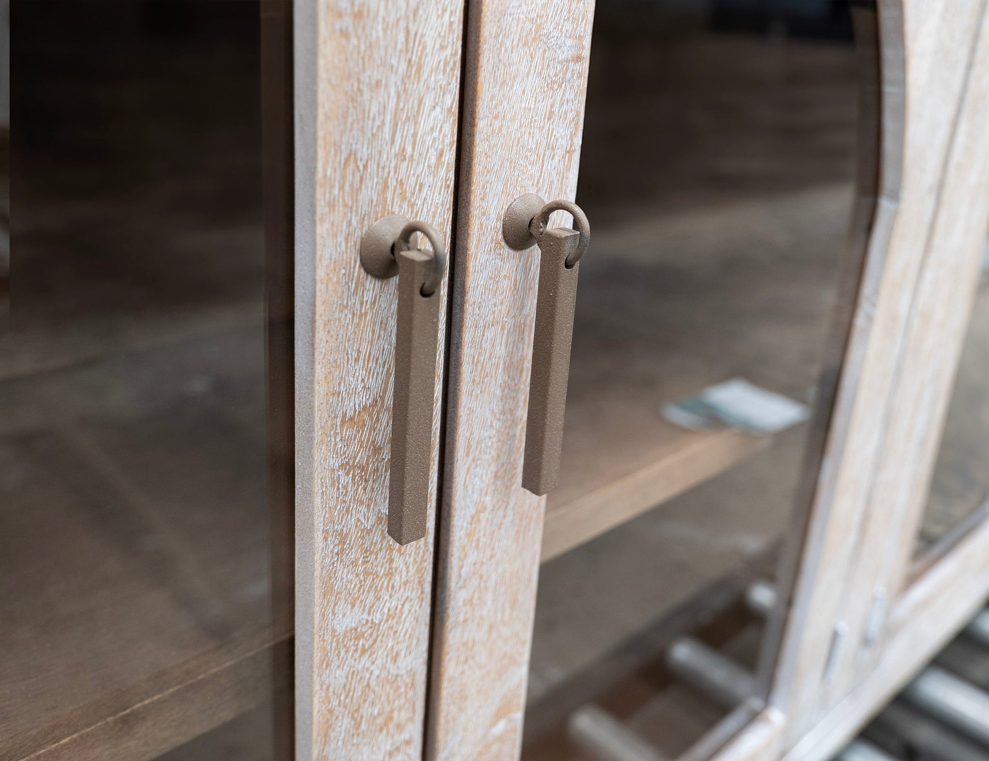 - Custom metal pendant handles in a bronze finish.