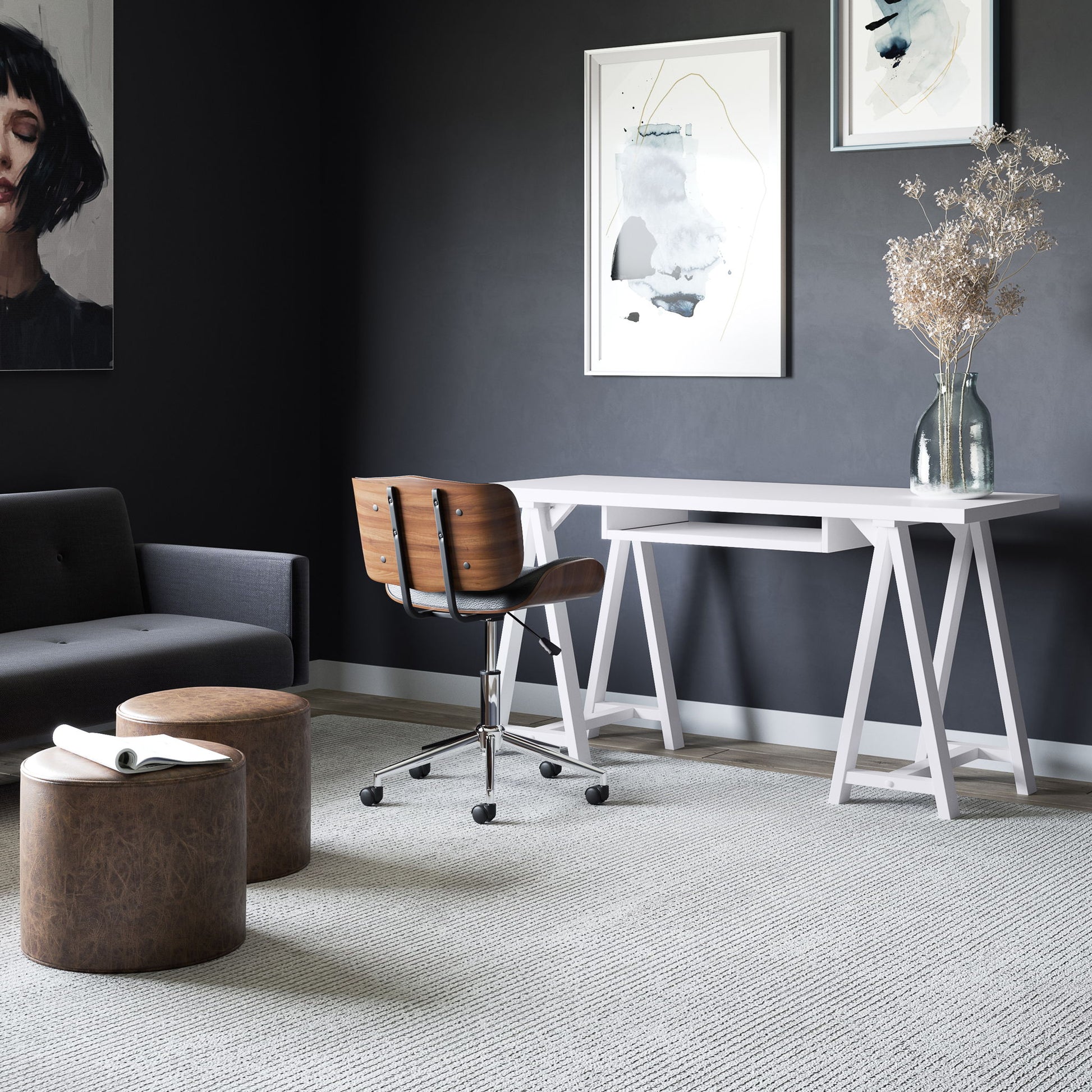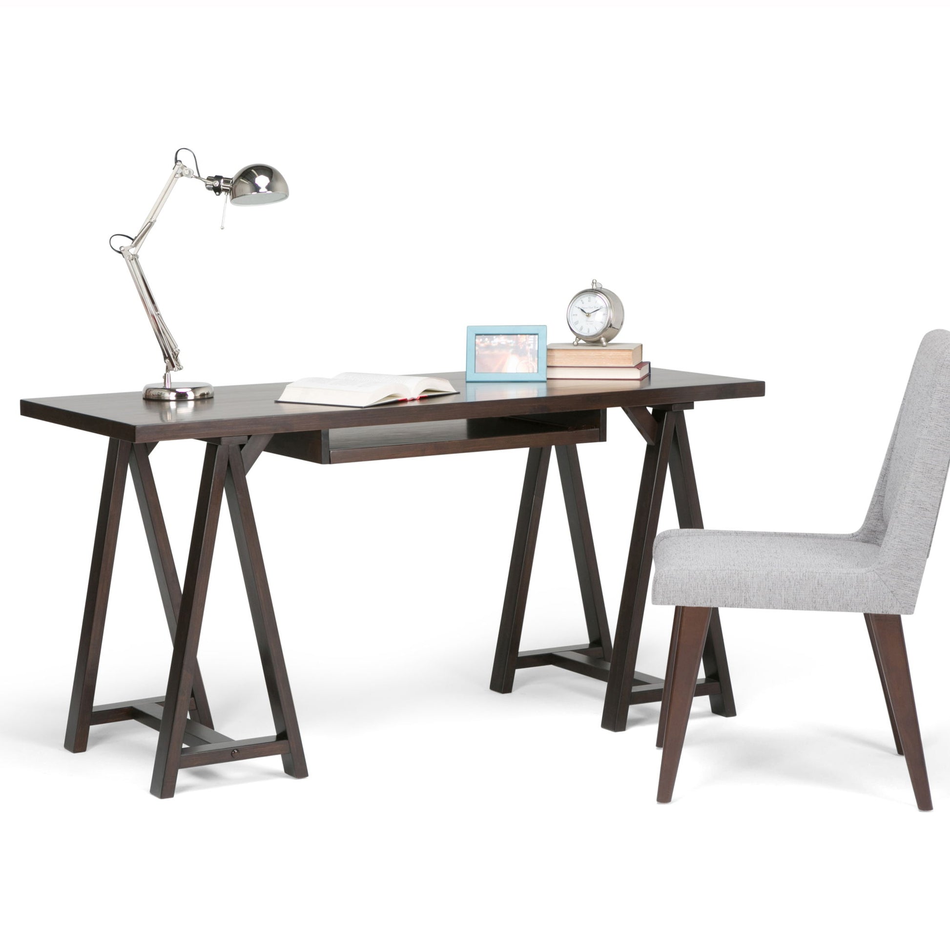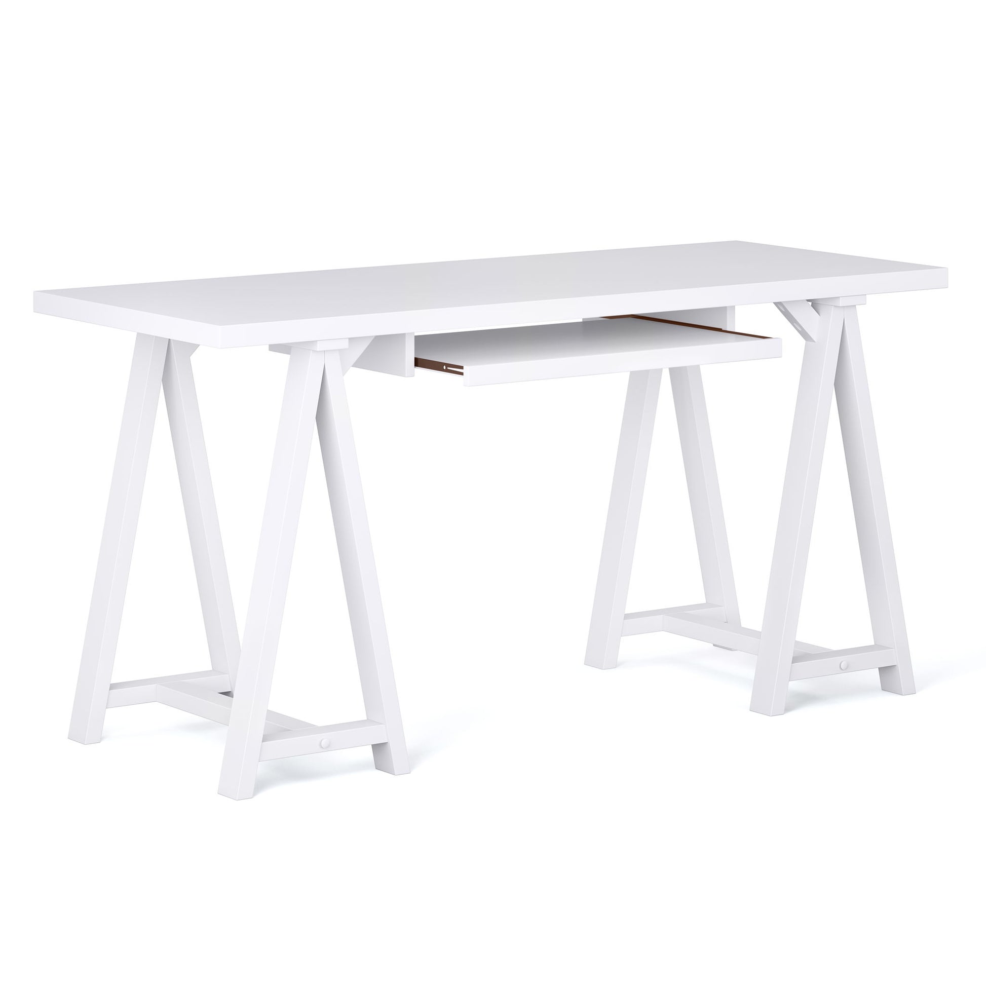 - Features a simple and wide, extra thick table top surface, integrated wood keyboard tray and sturdy sawhorse supports