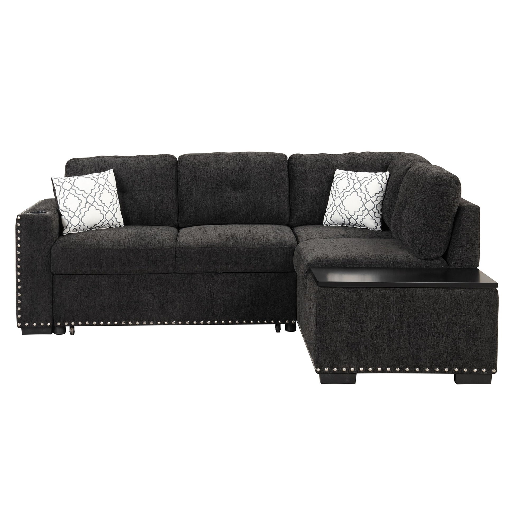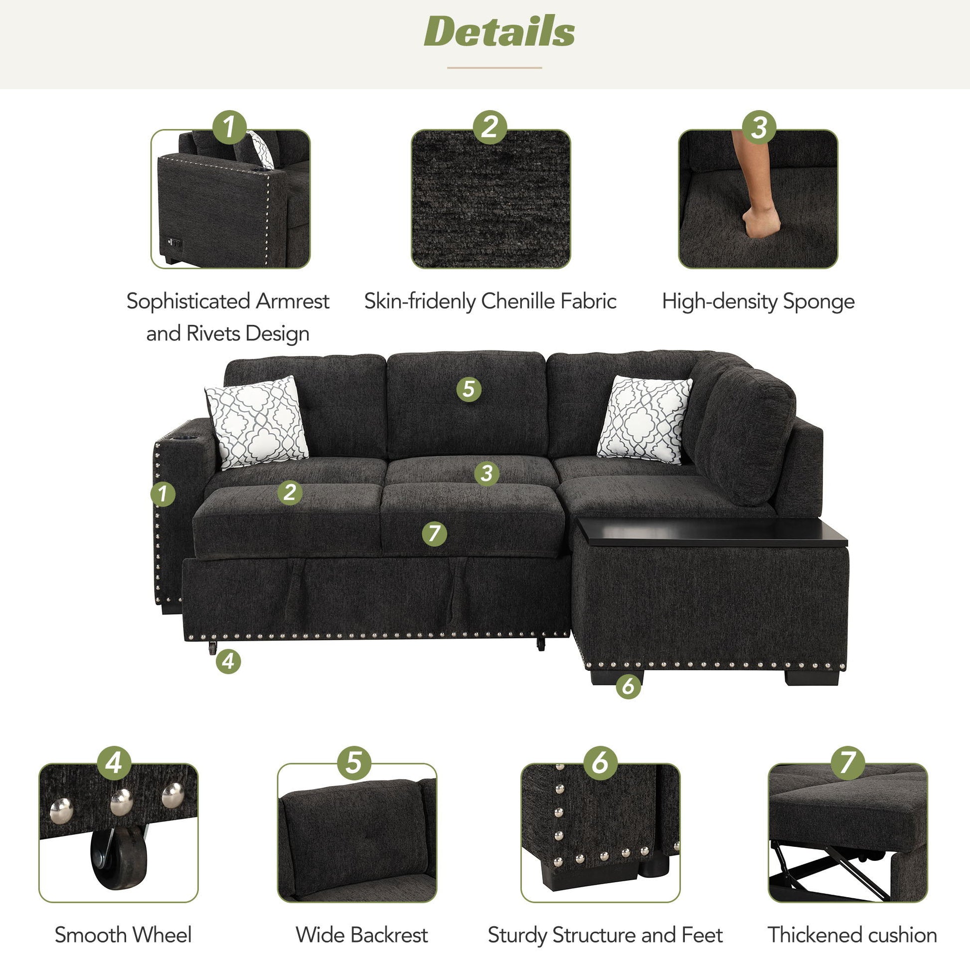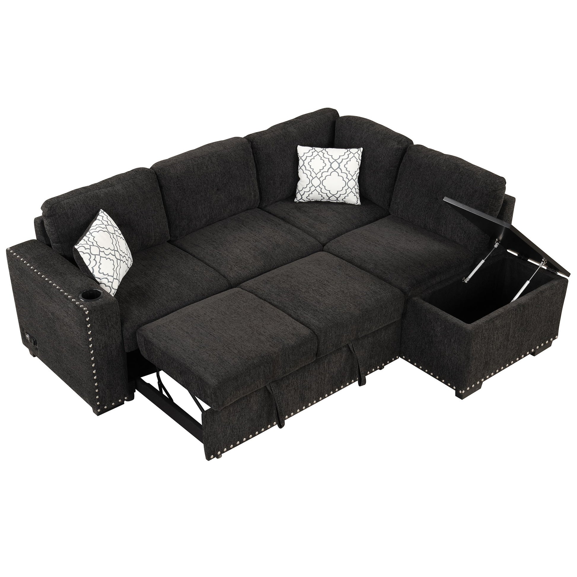 Sectional Pull-Out Sofa Bed L-Shaped Corner Sofa Couch With Storage Chaise, USB Ports, Power Sockets, Cup Holder For Living Room, Bedroom, Study - Black
